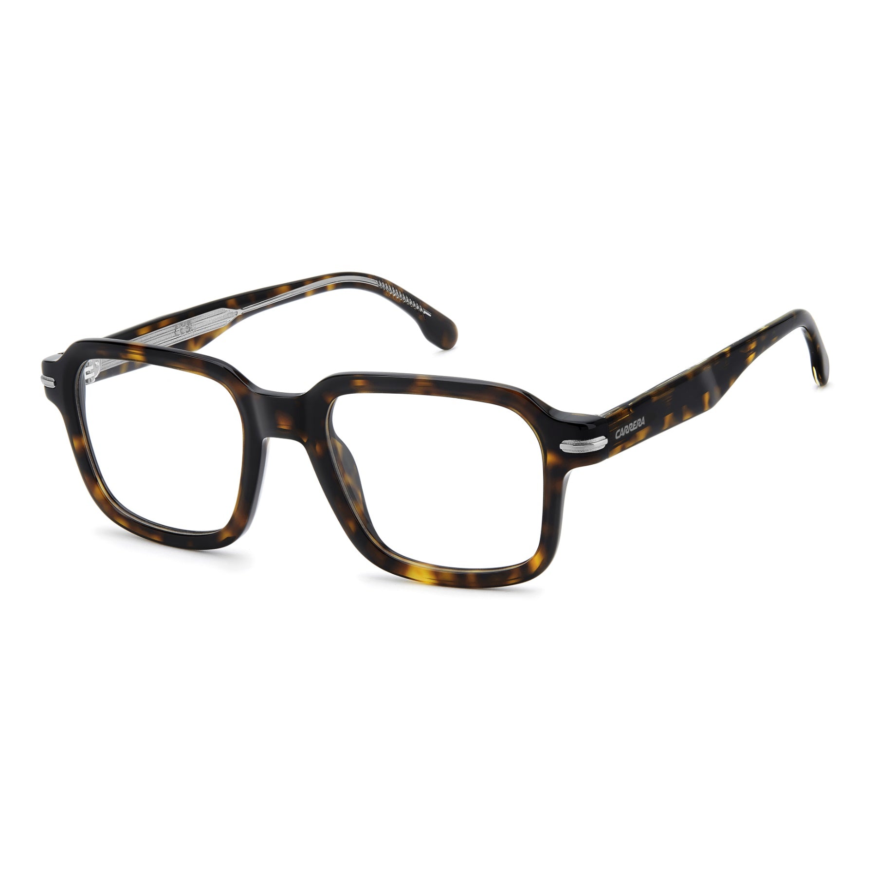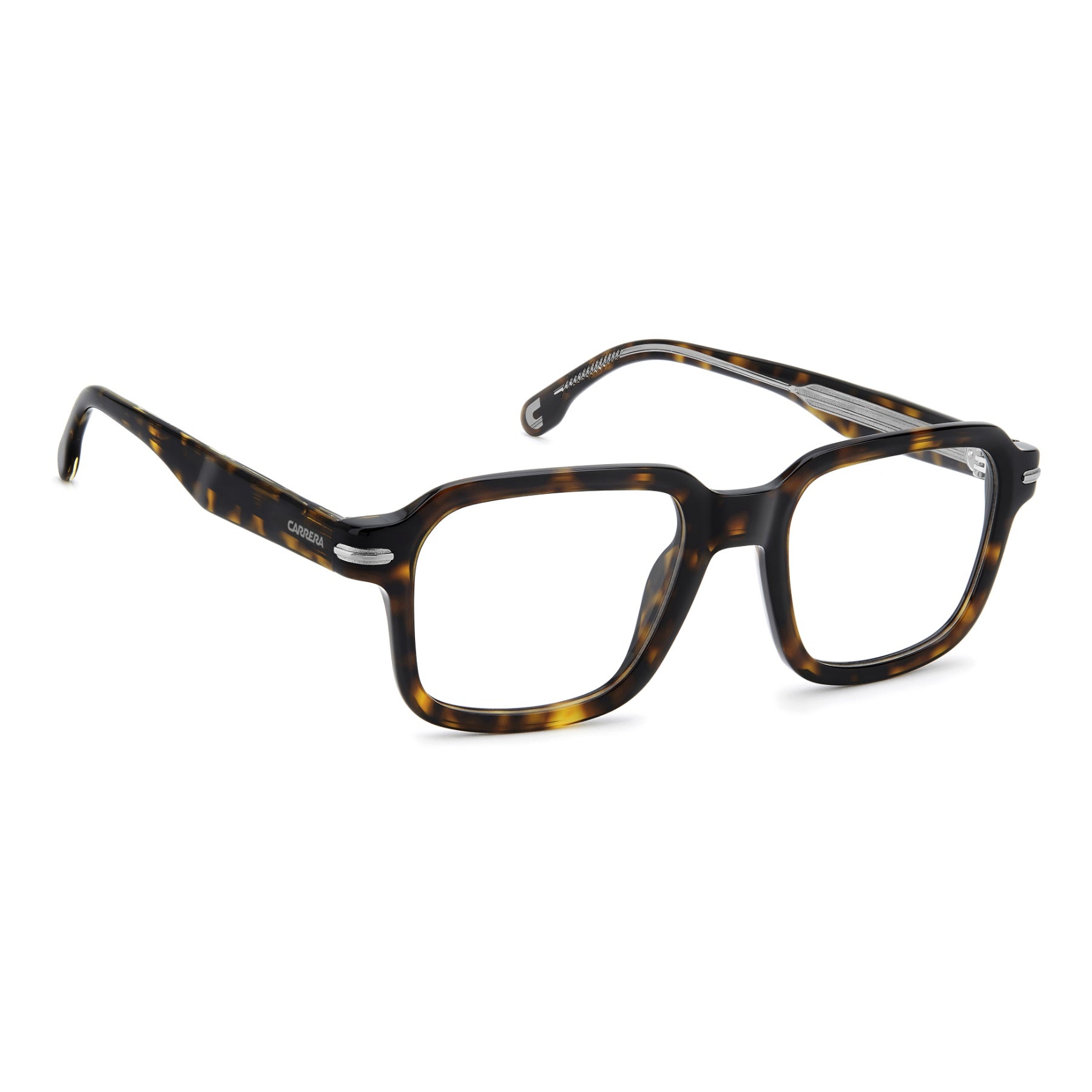 Carrera optical glasses add a decisive note to everyday outfits. Crafted in acetate, this style features a geometric front that's ultra-light thanks to its slim profile. Boldness meets precision in the sleek metal accents at the temples—a proud tribute to the iconic Carrera flag. The multi-layer version delivers timeless and unmistakable flair.
