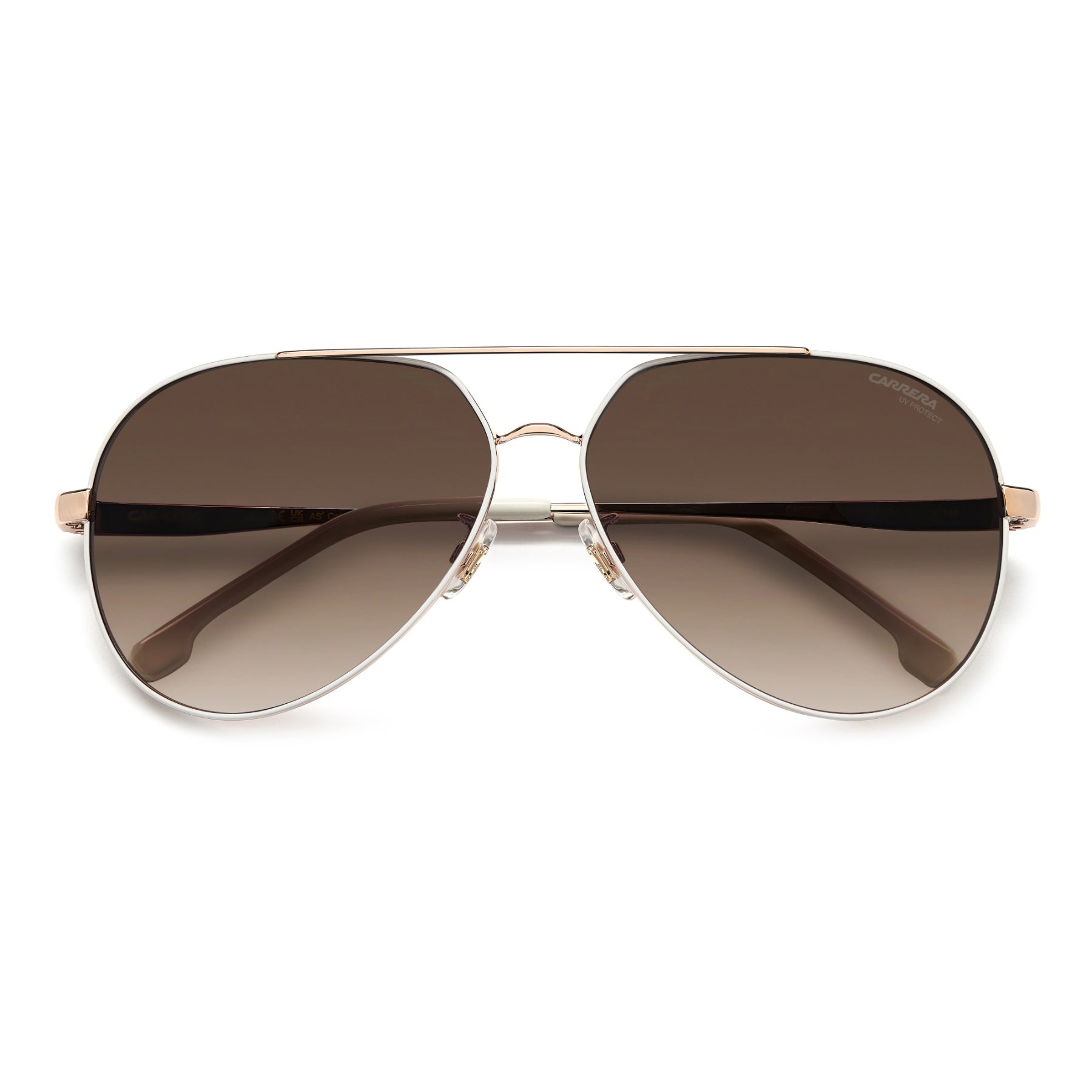 These women’s sunglasses are a modern take on an iconic Carrera silhouette—pilot frames—giving them an on-trend contemporary look. In lightweight stainless steel, they're distinguished by a double bridge that connects the teardrop frames. The temples are elevated by an etched logo and contrast end tips. The lenses are of note: not only do they come in gradient or polarized versions, they can also be fitted with prescription lenses