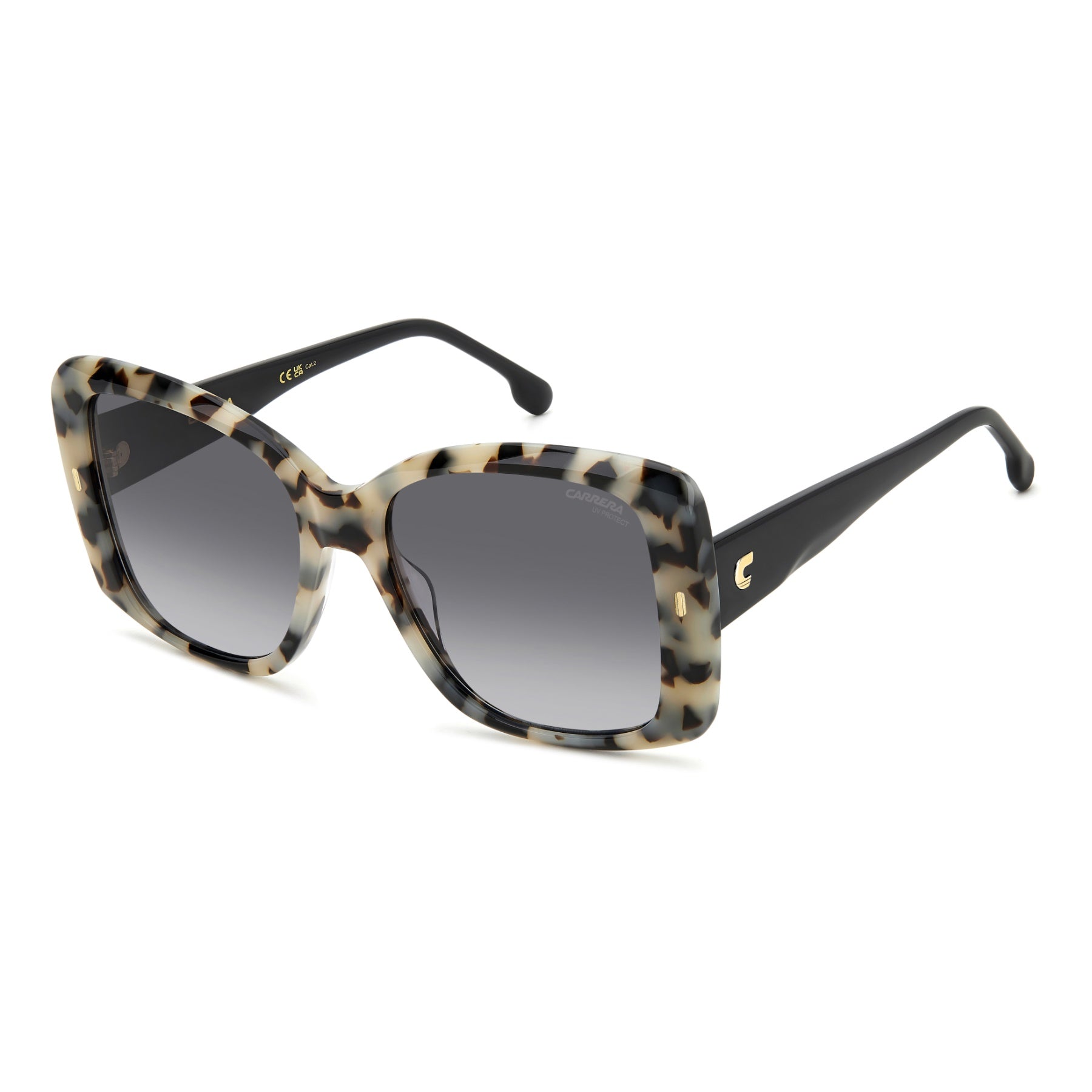 More than simple sunglasses, this Carrera look is a personal style statement. The butterfly shape is sophisticated, characterised by bold proportions that are in-line with the latest trends. The acetate structure is brightened by metal inserts, such as the rivets on the front and the embossed ‘C’ on the temples. These frames can be fitted with prescription lenses, and some versions come with polarized lenses.