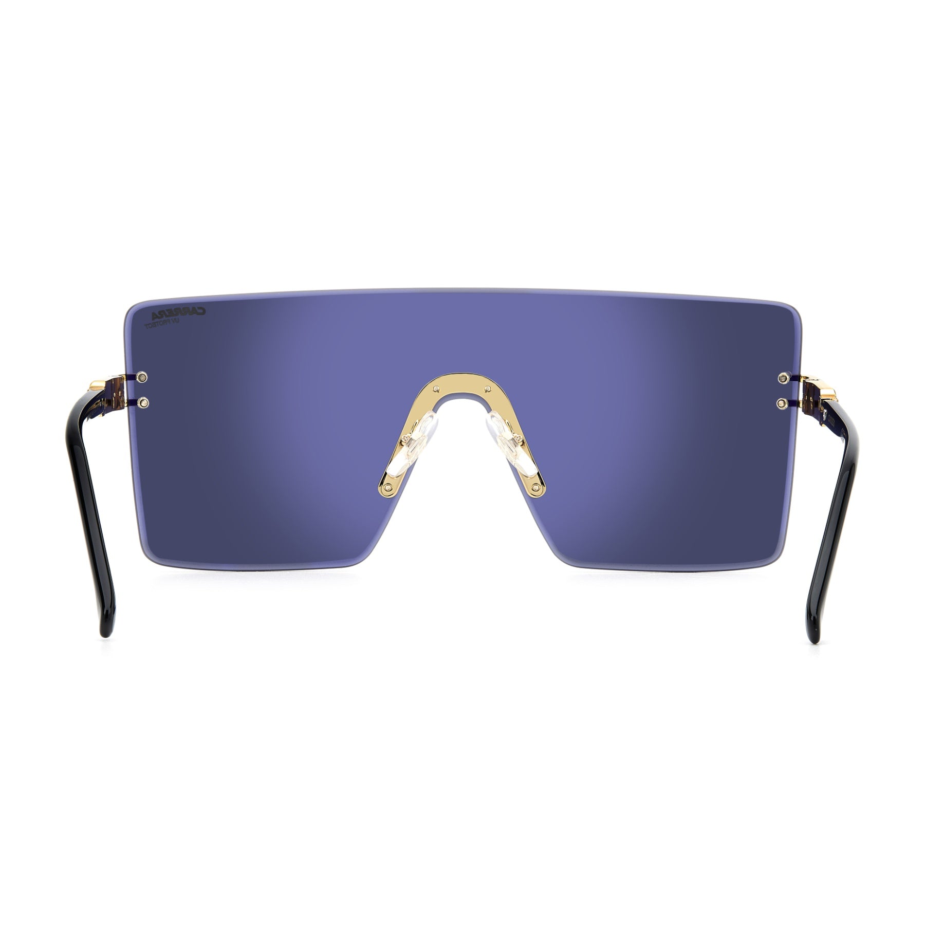 Unique at first sight: the front of these women's sunglasses is a rimless square shield lens trimmed by visible screws which are as functional as they are beautiful. The iconic temples have an embossed logo and acetate end tips, including a transparent option. Flex hinges guarantee on-point comfort. The mirrored lens versions are extra cool.