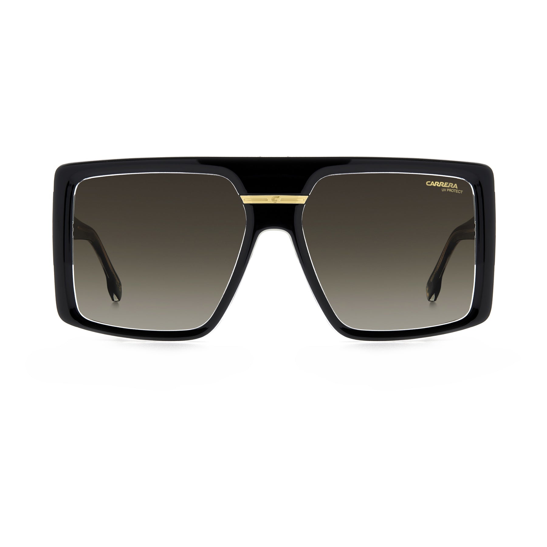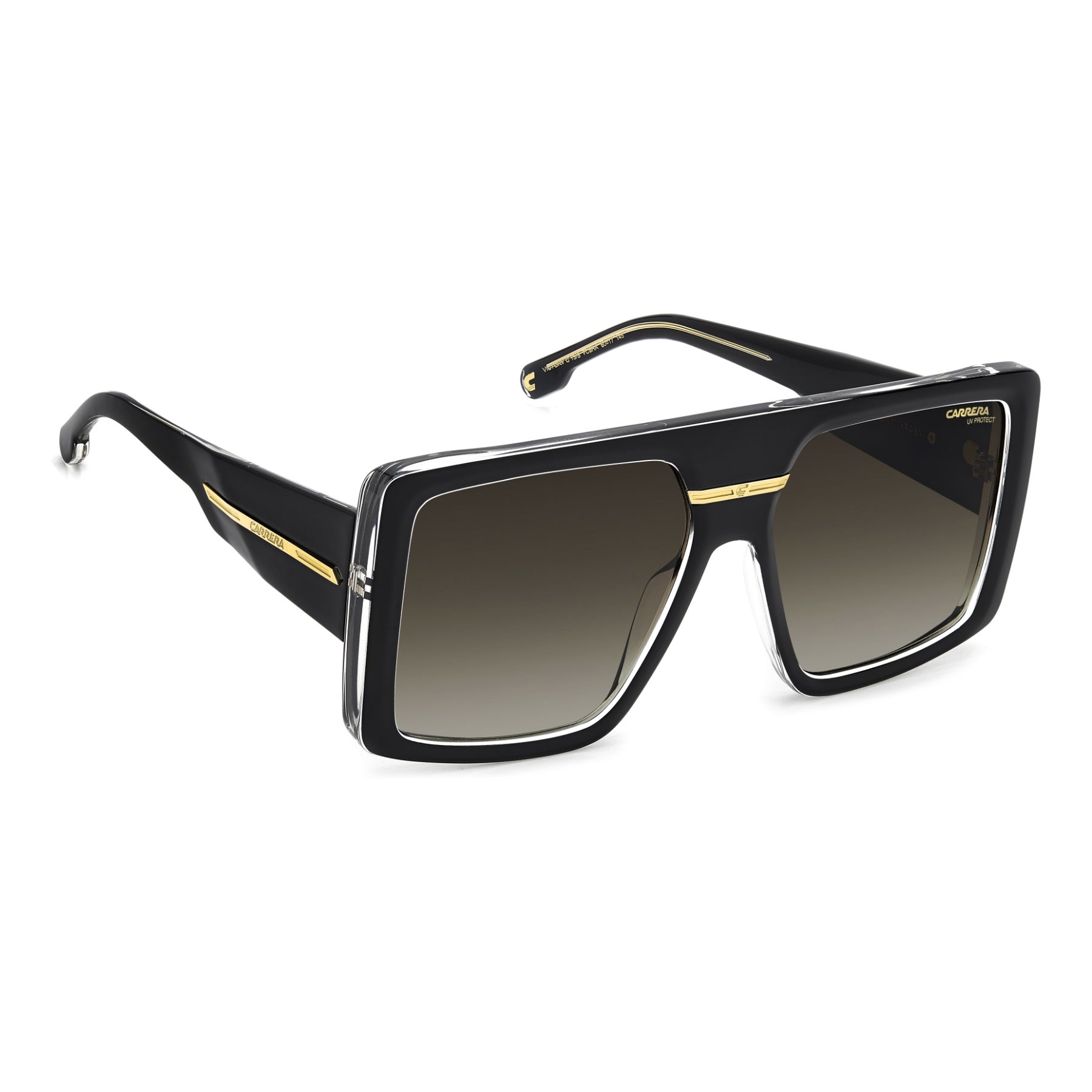 These Carrera sunglasses for women express the audacious style of the brand. The square front is bold, as are the temples. The metal plaque with the 'C' logo was inspired by the Carrera archives. These frames are made in Italy and come in a transparent version or in the black and gold combination that Carrera is known for. Mirrored lens versions are available.