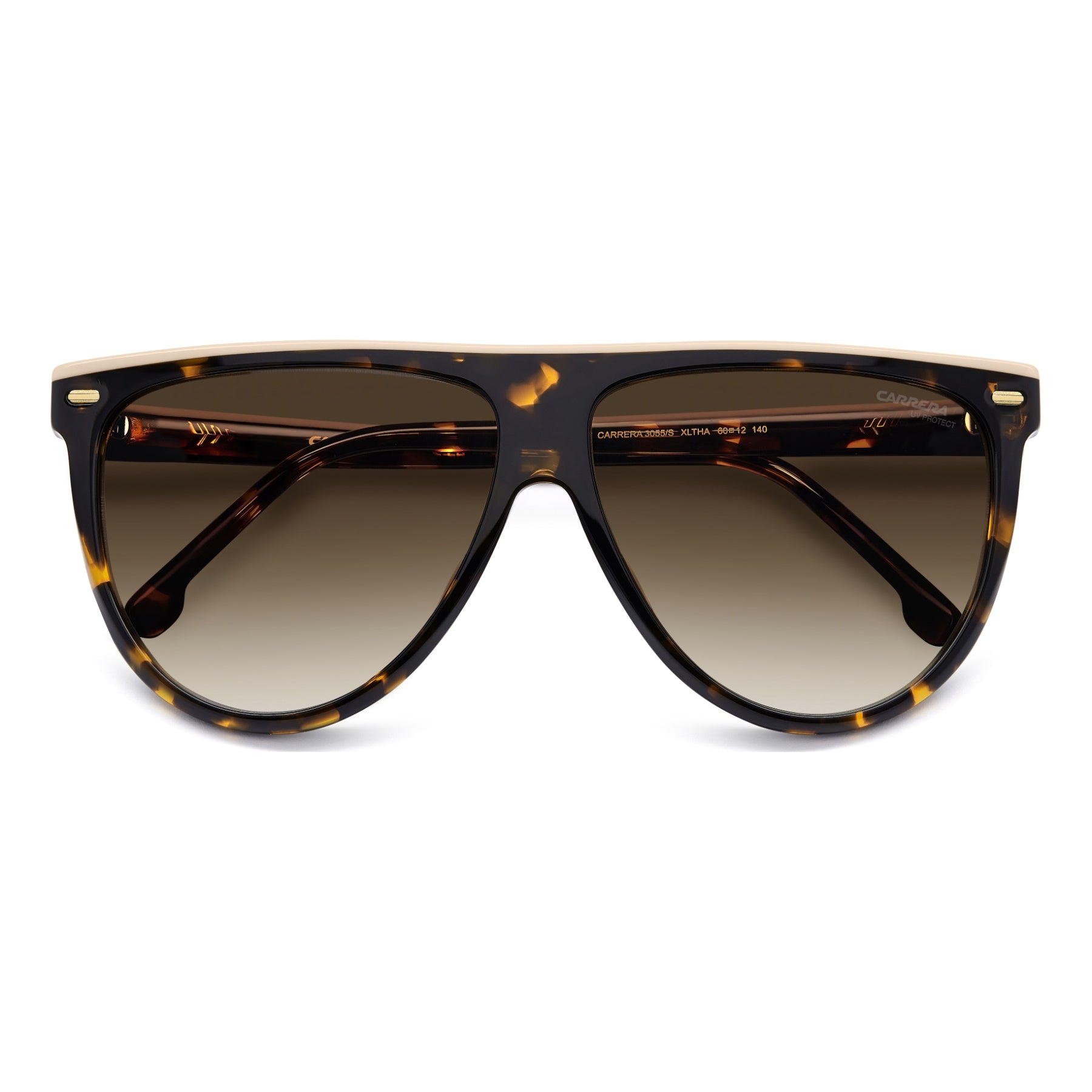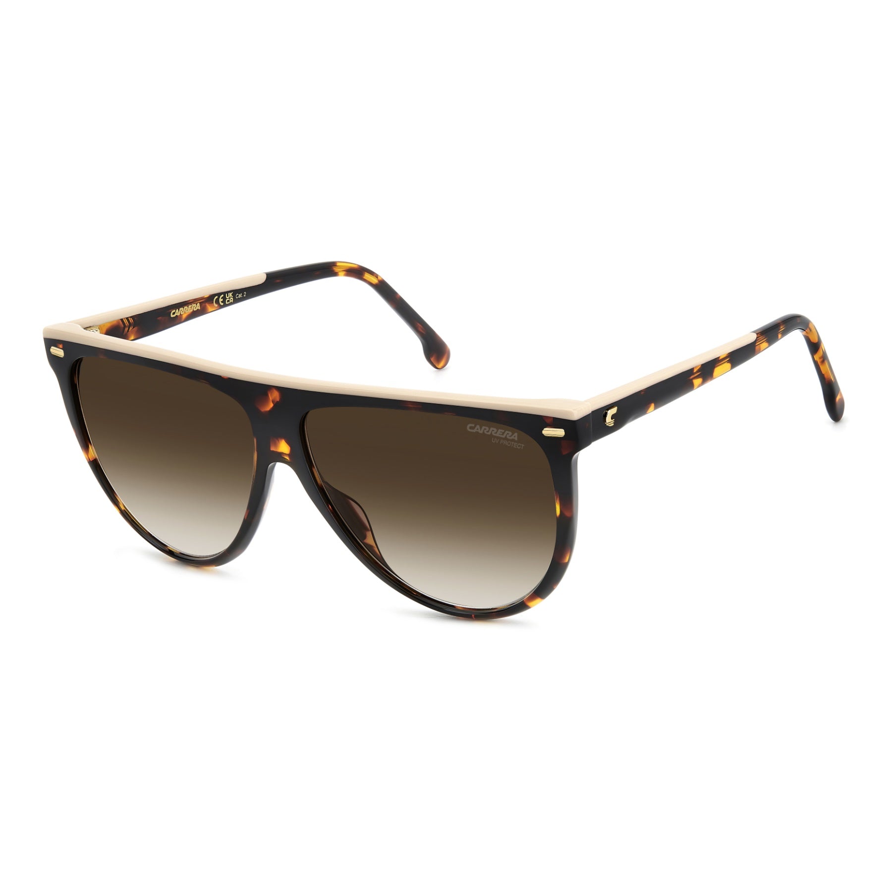 These Carrera women's sunglasses take a classic look and give it a Carrera twist. Flat along the top, one version has a contrast insert to accentuate the silhouette. The metal rivets add a bit of shine, and the embossed 'C' on the temples is instantly recognizable. The gradient aviator lenses come in polarized versions.