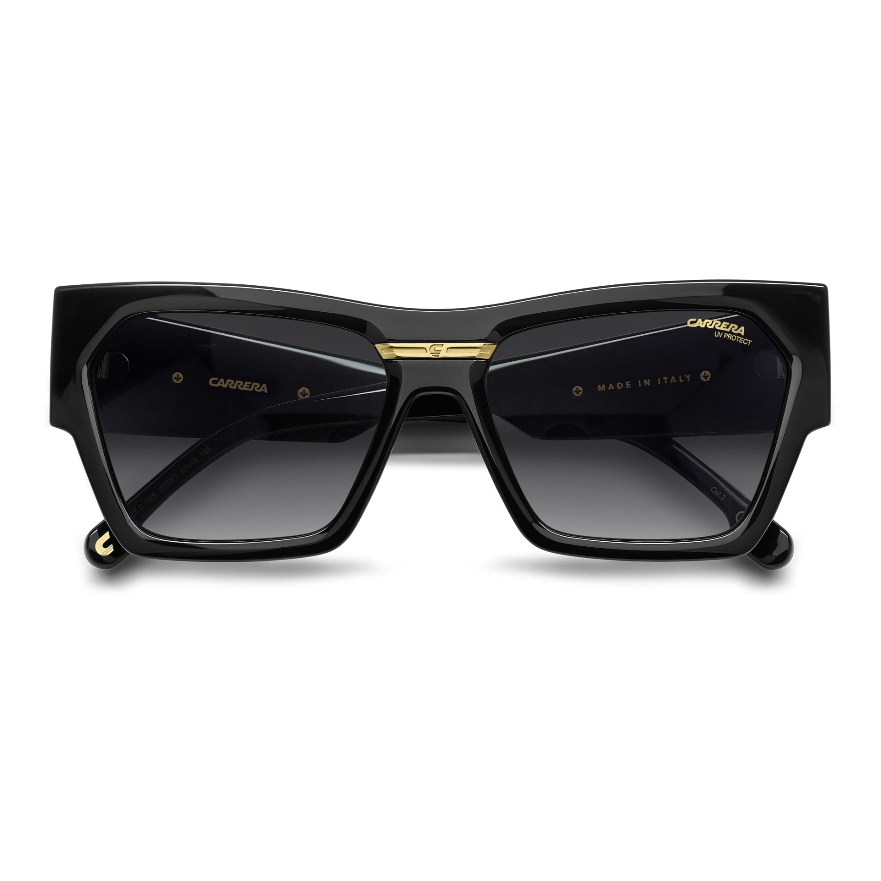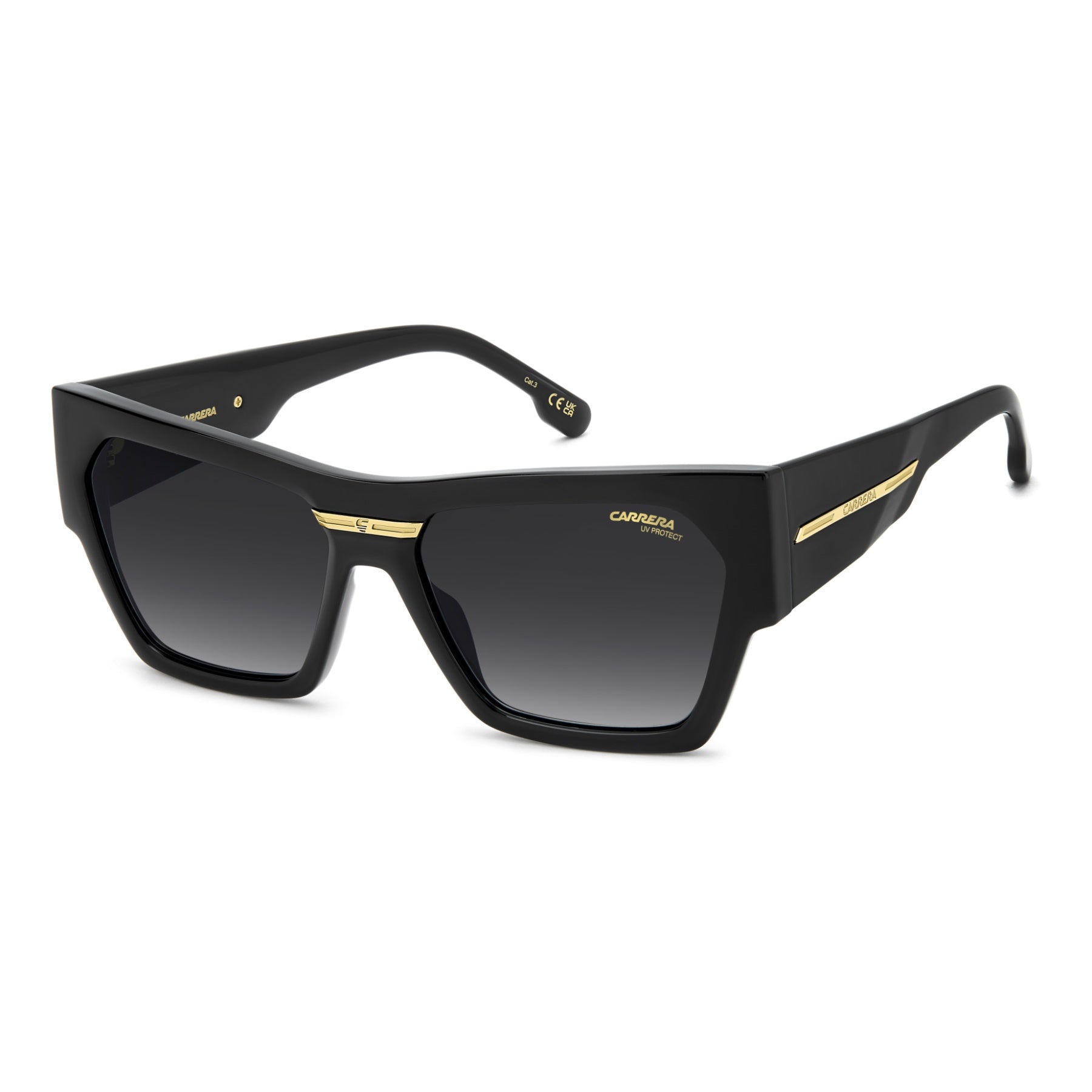Made-in-Italy sunglasses with a bold attitude. These Carrera frames feature a modern cat-eye front and new oversized temples for the season. The Victory ‘C’ metal plaque adds an iconic touch. Available in classic black and gold or seasonal colours, including a transparent option.