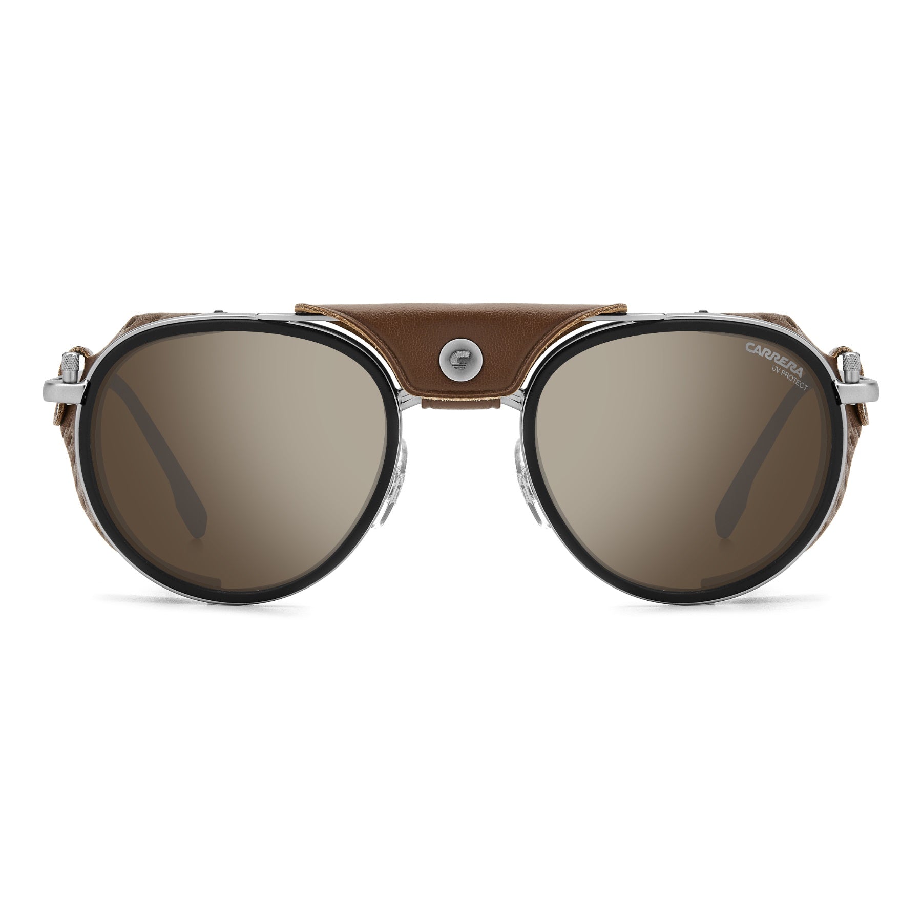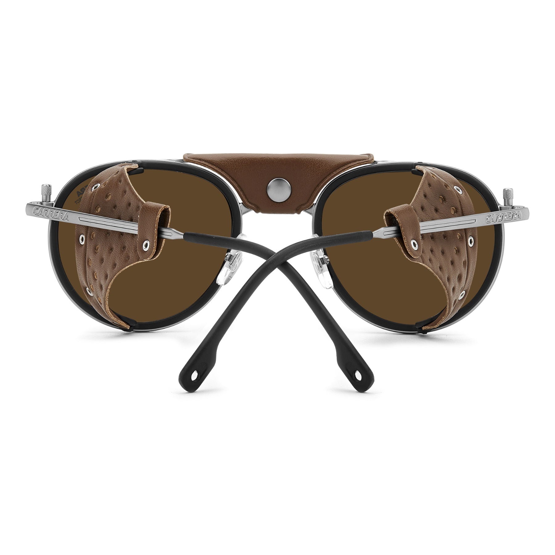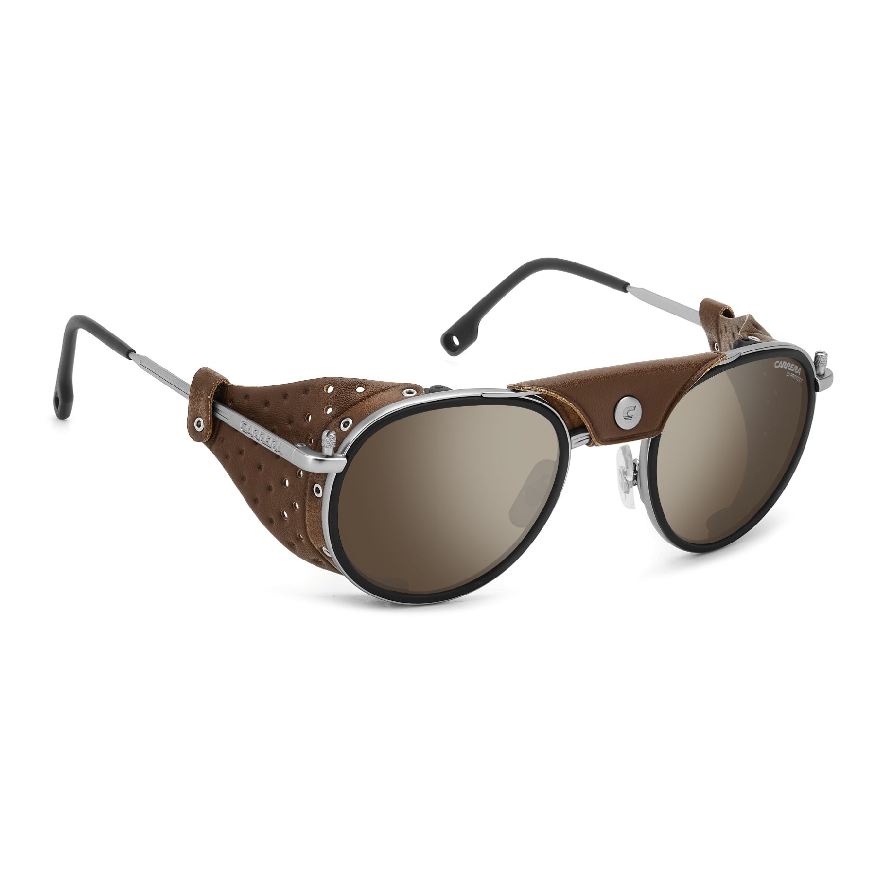 Diese Sonnenbrille von Carrera wurde von alpinen Landschaften inspiriert. Das Gestell aus Metall wird von abnehmbaren Kunstlederelementen an den Seiten und einem doppelten Nasensteg ergänzt, die vor Licht und Wind schützen. Die Bügelenden können angepasst werden und bleiben dank ihrer gebogenen Form fest an ihrem Platz. Spezielle Öffnungen ermöglichen das Anbringen einer elastischen Schnur, die separat erworben werden kann, damit die Brille auch bei den schwierigsten Klettertouren nicht verloren geht. Sie ist mit verspiegelten oder photochromen Gläsern erhältlich.
