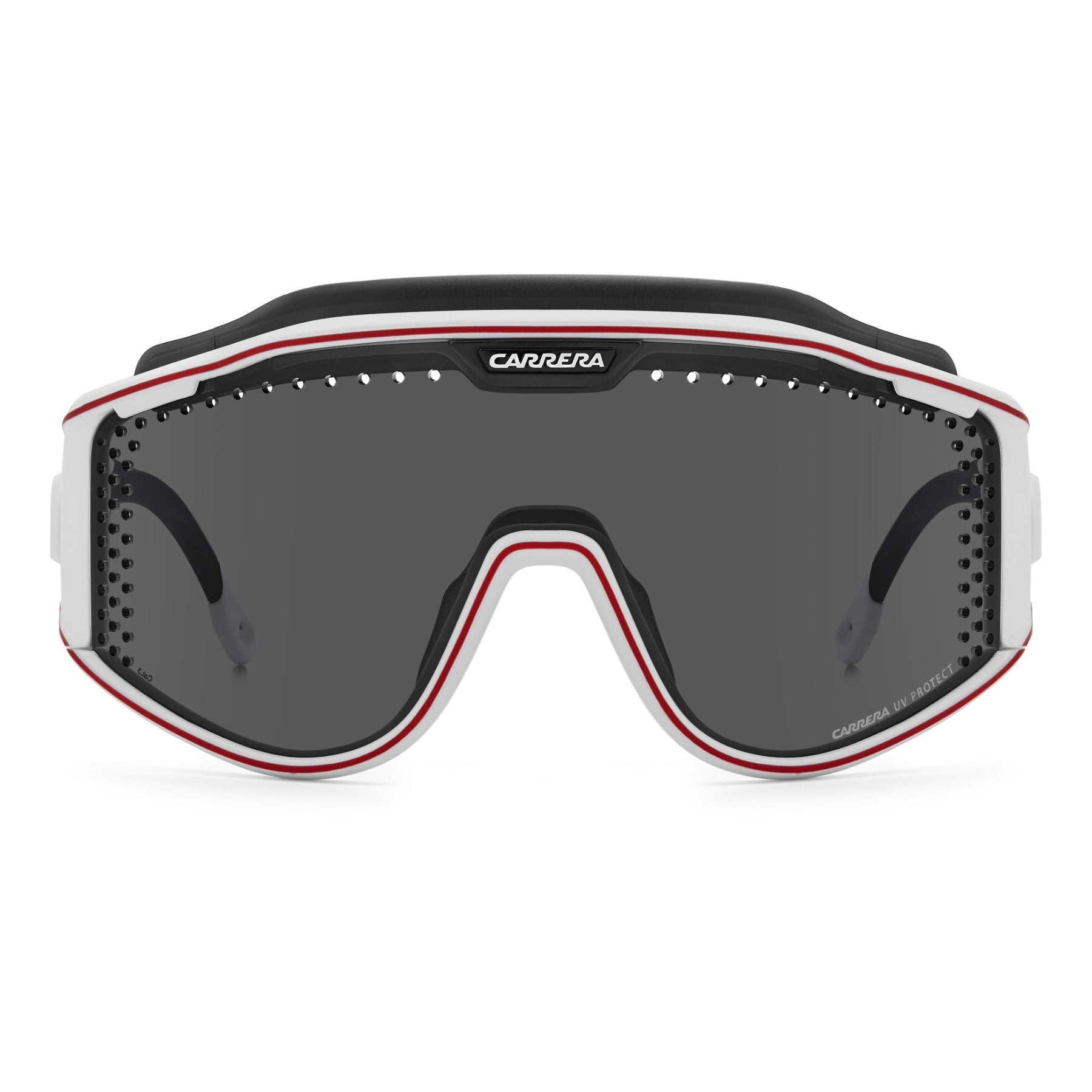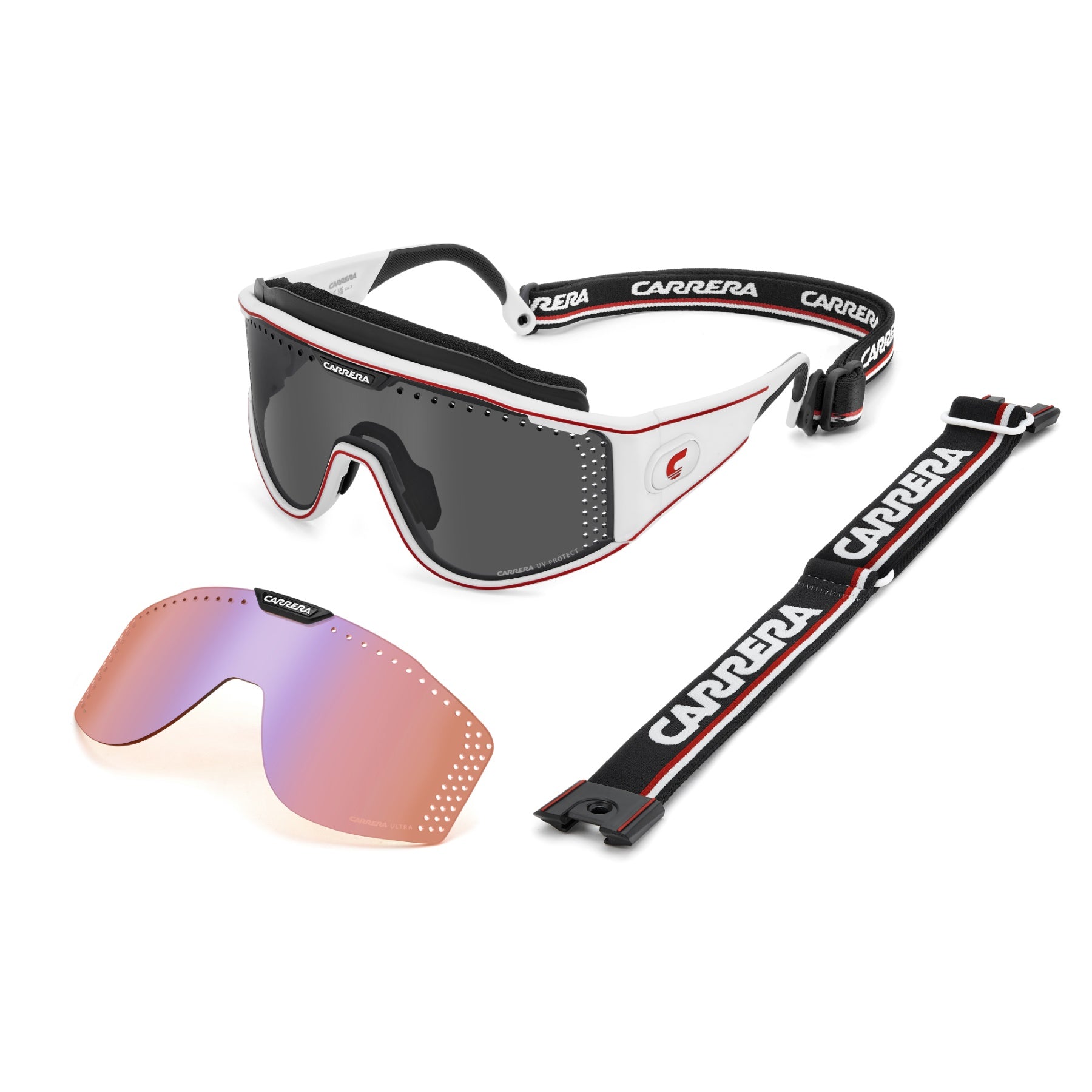 Diese Sonderedition der Sonnenbrille von Carrera ist mit einer Front mit Monoscheibe und Belüftungslöchern versehen und würdigt die sportliche Tradition der Marke. Durch ein innovatives Magnetsystem lassen sich die Bügel abnehmen und durch ein Band aus Gummi mit Markenlogo ersetzen, sodass dieses kultige Modell als Schneebrille verwendet werden kann. Zwei Gläser mit unterschiedlichen Technologien können dank des patentierten Boombox-Systems von Carrera einfach ausgetauscht werden, die alle im Komplettpaket enthalten sind.