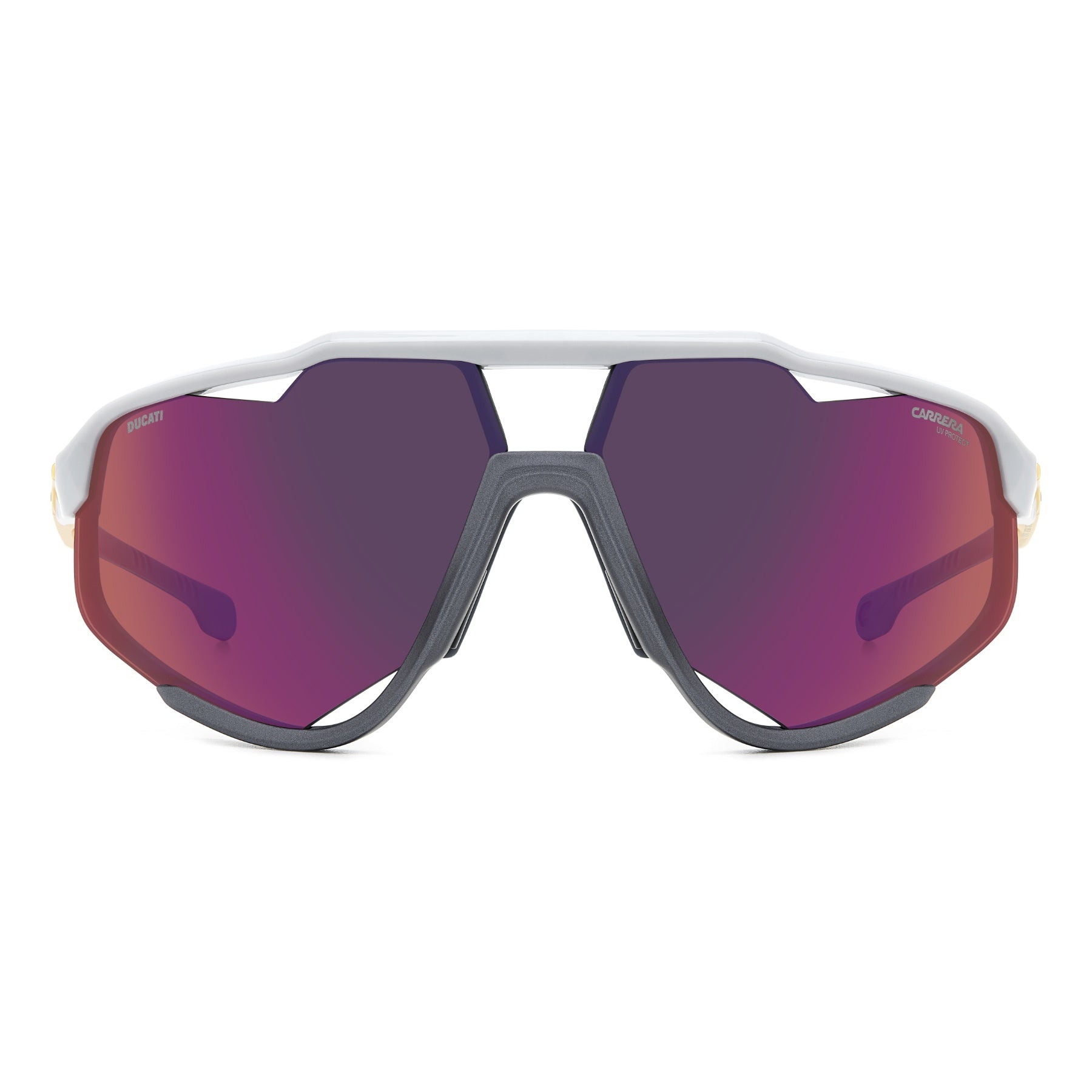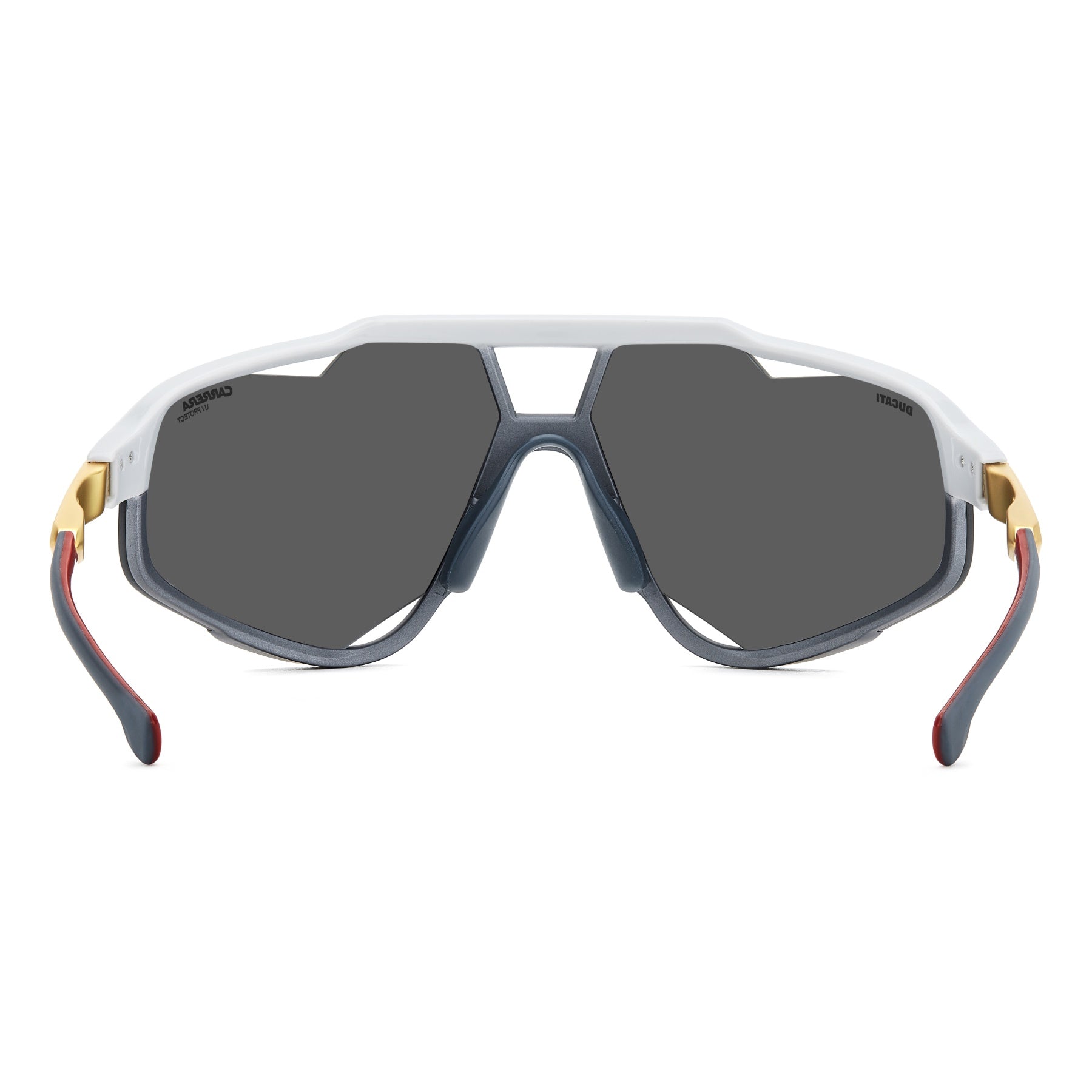 Wenn es eine Sonnenbrille gibt, die alle Fans von Brillen von Carrera | Ducati kennen, tragen und schätzen sollten, dann ist es diese. Sie wurde zur Feier der Markteinführung der neuen Panigale entworfen und hat bereits Geschichte geschrieben. Der Schutz der Augen wird durch die Vollabdeckung der Front gewährleistet, die durch Belüftungsöffnungen, verstellbare Nasenpads und verspiegelte Gläser ergänzt wird. Die Bügel sind aus Metall und zeichnen sich durch aerodynamische Linien aus, die von den Lüftungsschlitzen der legendären Ducati Panigale inspiriert sind, sowie durch ein kontrastierendes Logo und bequeme, gummibeschichtete Bügelenden.