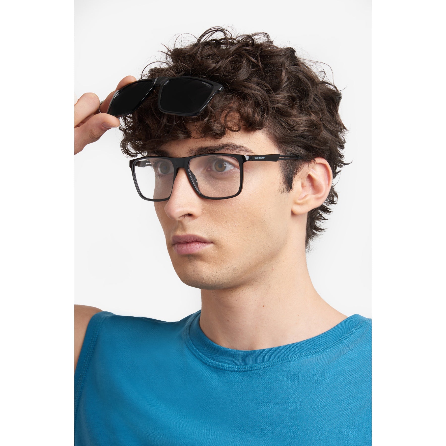 Las gafas graduadas de Carrera con clip de lentes solares encarnan de veras la tendencia de la ropa informal y deportiva. La montura es en poliamida, un material de altas prestaciones, famoso por su ligereza y durabilidad. Las varillas presentan una apertura distintiva en ultem, un material no deformable y ligero en el color del logotipo. La montura se transforma fácilmente en unas gafas de sol: solamente se han de poner las lentes solares polarizadas para una protección máxima durante las horas soleadas de la jornada.