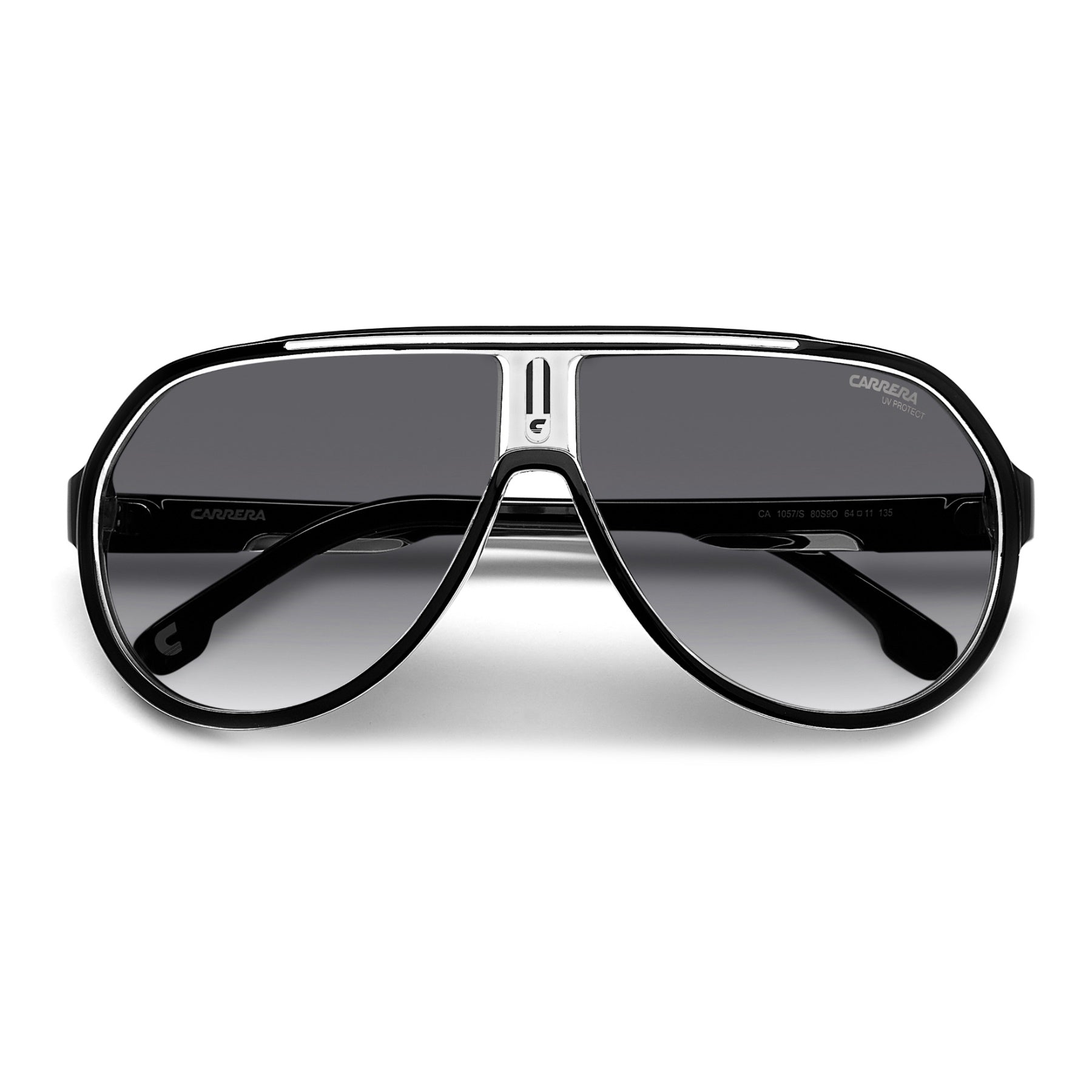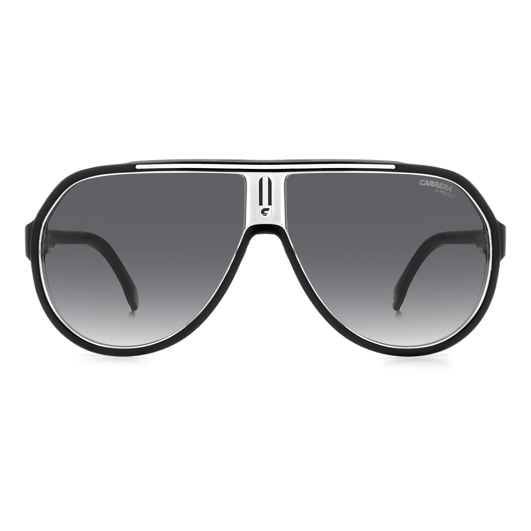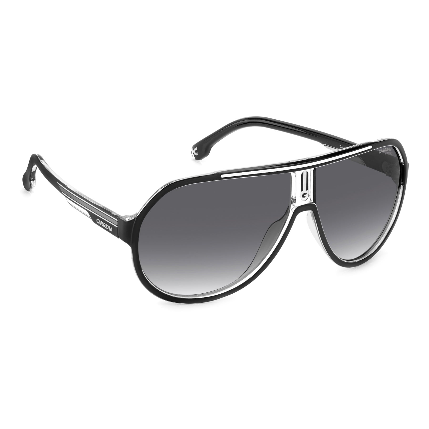 Estas gafas de sol de aviador, típicas de la marca, rediseñan un clásico de Carrera. Destacan entre todas por los elementos personalizados de culto, tales como la "C" en el frente, el logotipo de la inscripción y la bandera de la marca comercial Carrera en las varillas esculpidas. Este accesorio está disponible con lentes degradadas o polarizadas y combina elementos futuristas con un diseño retro.