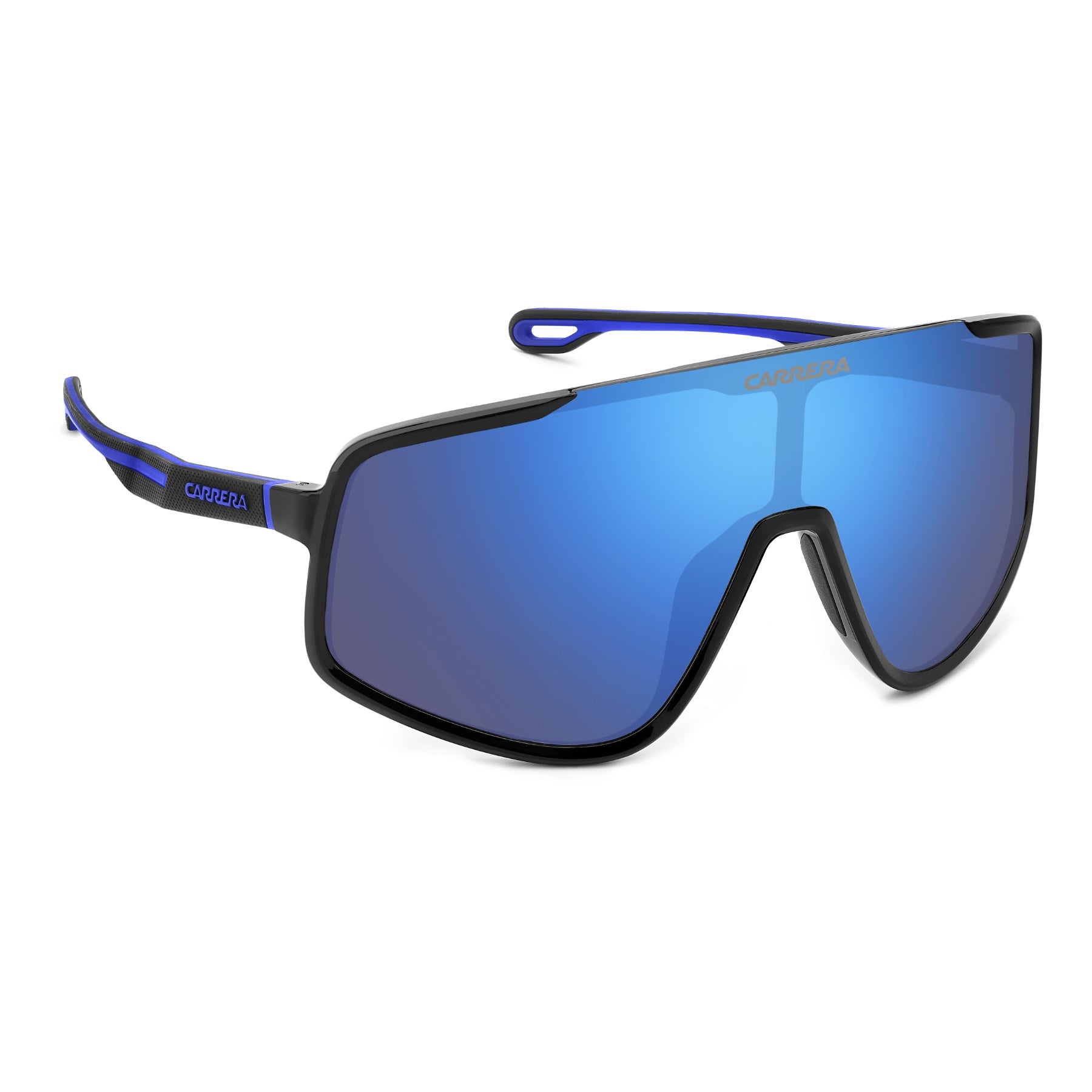 Estas gafas de sol de Carrera son deportivas y de grandes prestaciones. La lente pantalla grande es llamativa, estándar o de espejo, y se sujeta mediante una sola montura, abierta en la parte superior. Las varillas en dos colores son también muy seductoras y crean una forma ligeramente plegada. Están inyectadas-moldeadas en dos materiales y colores, con insertos de goma, que representan la bandera famosa de Carrera. Los orificios en los terminales se inspiran en estilos de vida activos y el logotipo de Carrera garantiza un lugar en primer plano en el mundo de la moda.
