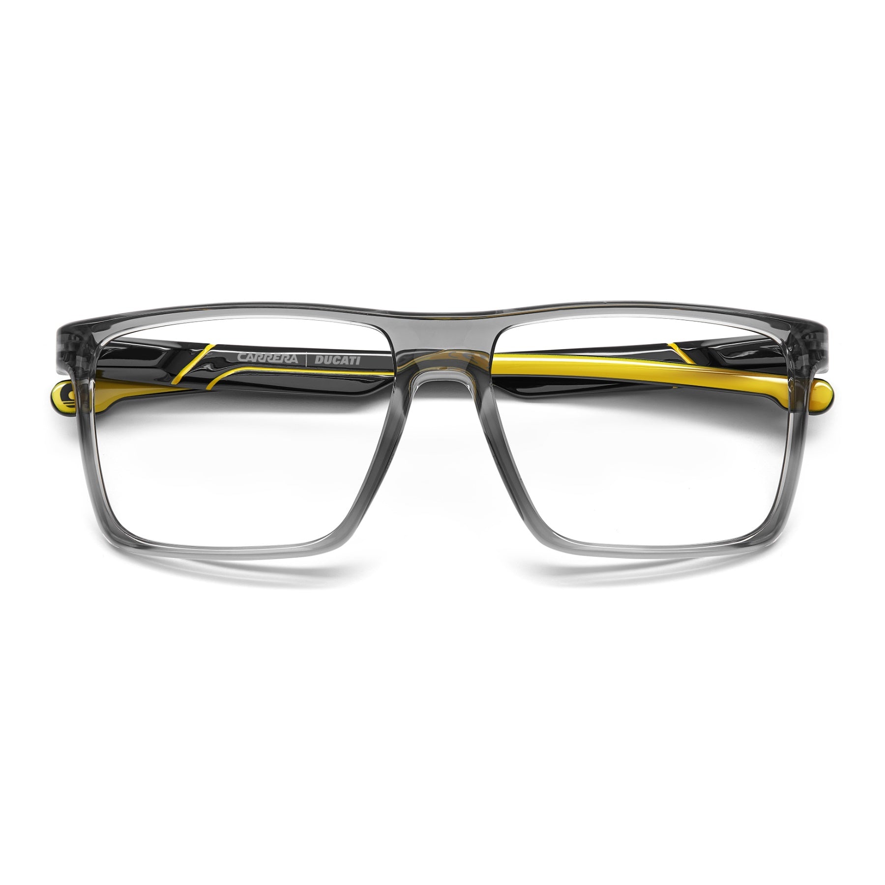 Estas gafas graduadas Carrera | Ducati amalgaman, instantáneamente, un diseño reconocible con la comodidad diaria. Las varillas esculpidas rinden homenaje a la estética Ducati con insertos de metal y logotipos visibles que se notan. Un frente de plástico para ofrecer un confort ligero y bisagras flexibles en aras de la duración. La paleta de colores neutros se tiñe de notas de color, que destacan el carácter de esta colaboración. El estilo se impulsa y traslada el espíritu racing a tus looks de todos los días.