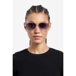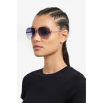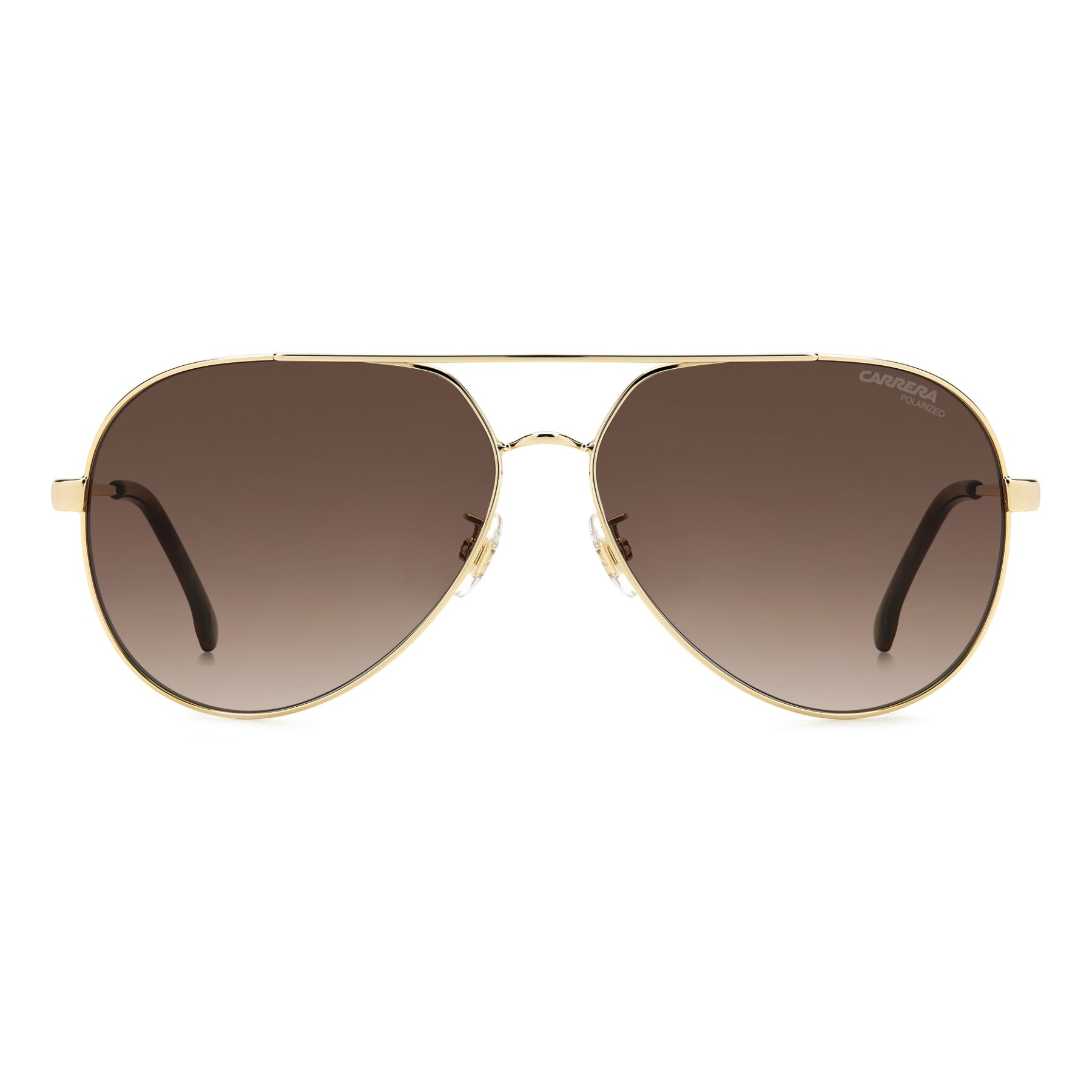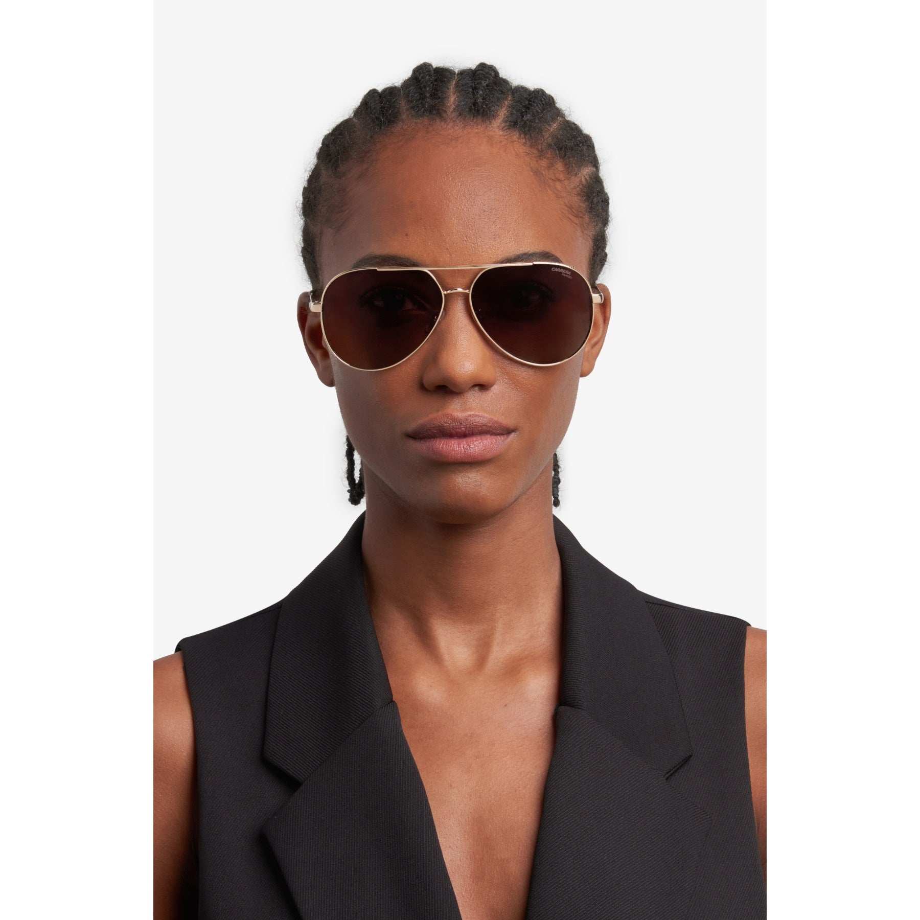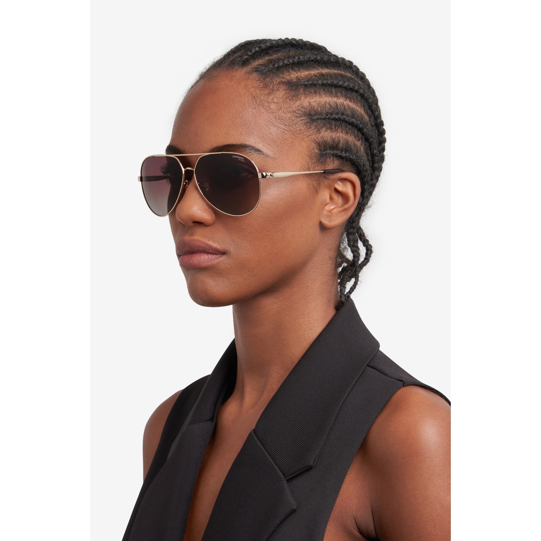 Estas gafas de sol de mujer interpretan en clave moderna una silueta icónica de Carrera -la montura piloto- y para aportarle un look contemporáneo de moda. Realizadas en acero inoxidable ligero, destacan por un doble puente, que conecta los aros en forma de gota. Las varillas se elevan con un logotipo grabado y terminales en contraste. Las lentes son interesantes: se proponen en las versiones degradadas o polarizadas, pero pueden ser, también, de corrección.