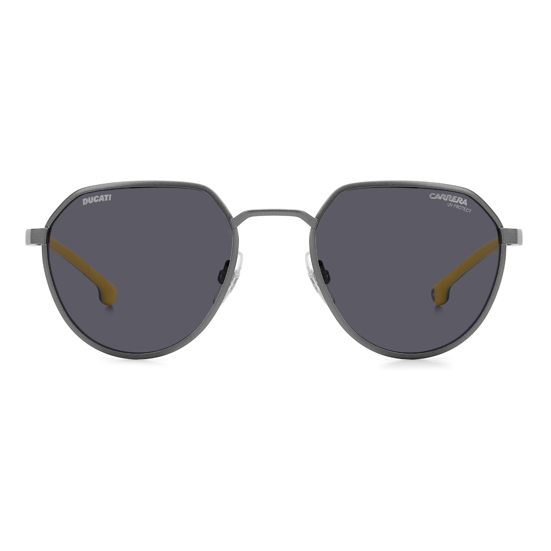 Ces lunettes de soleil Carrera | Ducati sont caractérisées par un style sporty impeccable. Leur monture Pantos géométrique délicieusement moderne saura flatter aussi bien les visages féminins que masculins. Compatible avec des verres correcteurs. Les branches en aluminium se composent de charnières flexibles et de manchons en caoutchouc brillant, les rendant idéales sous un casque de moto. Ces lunettes existent également en aluminium brossé, clin d'œil direct à l’univers des motos, complétées par des verres en version miroir ou polarisé.