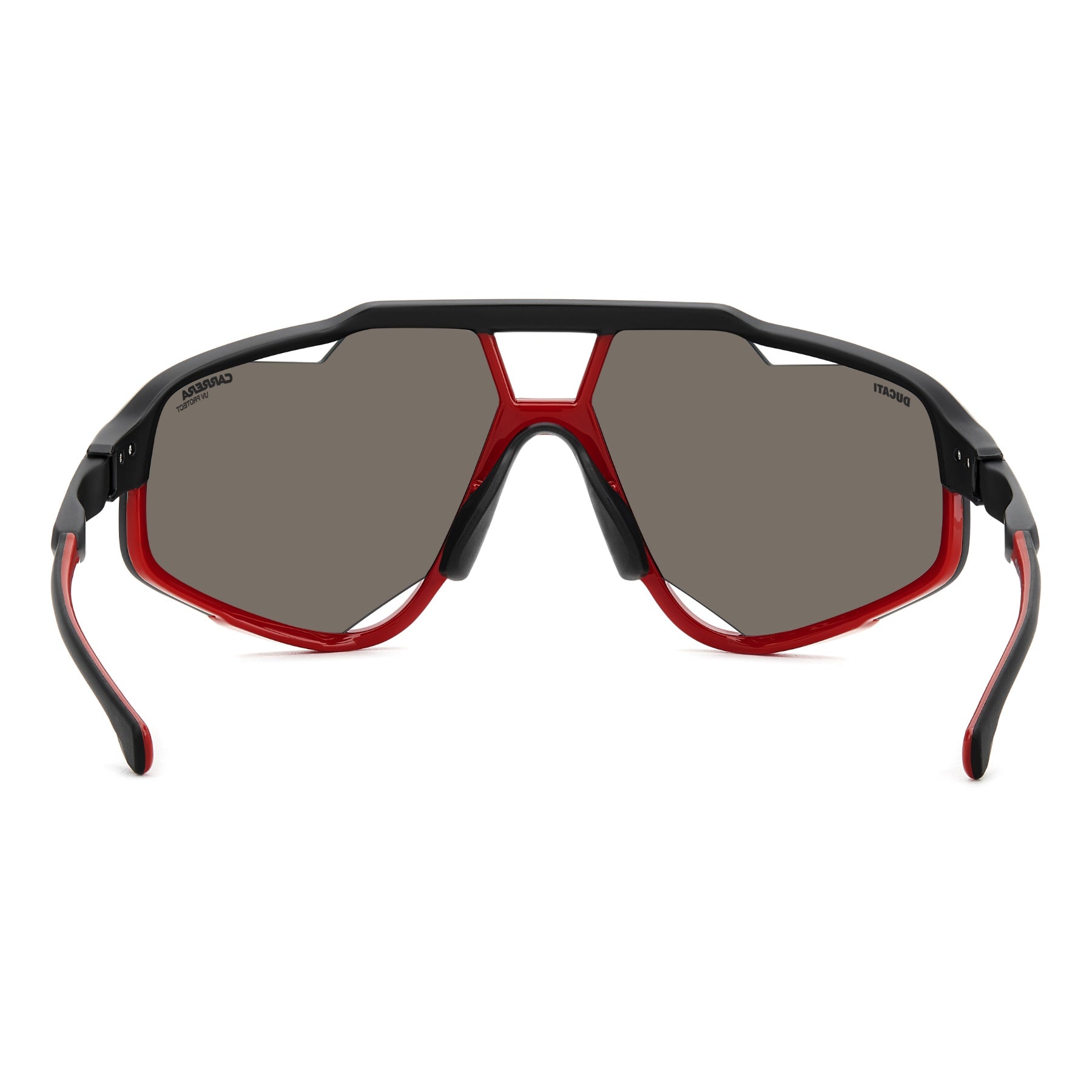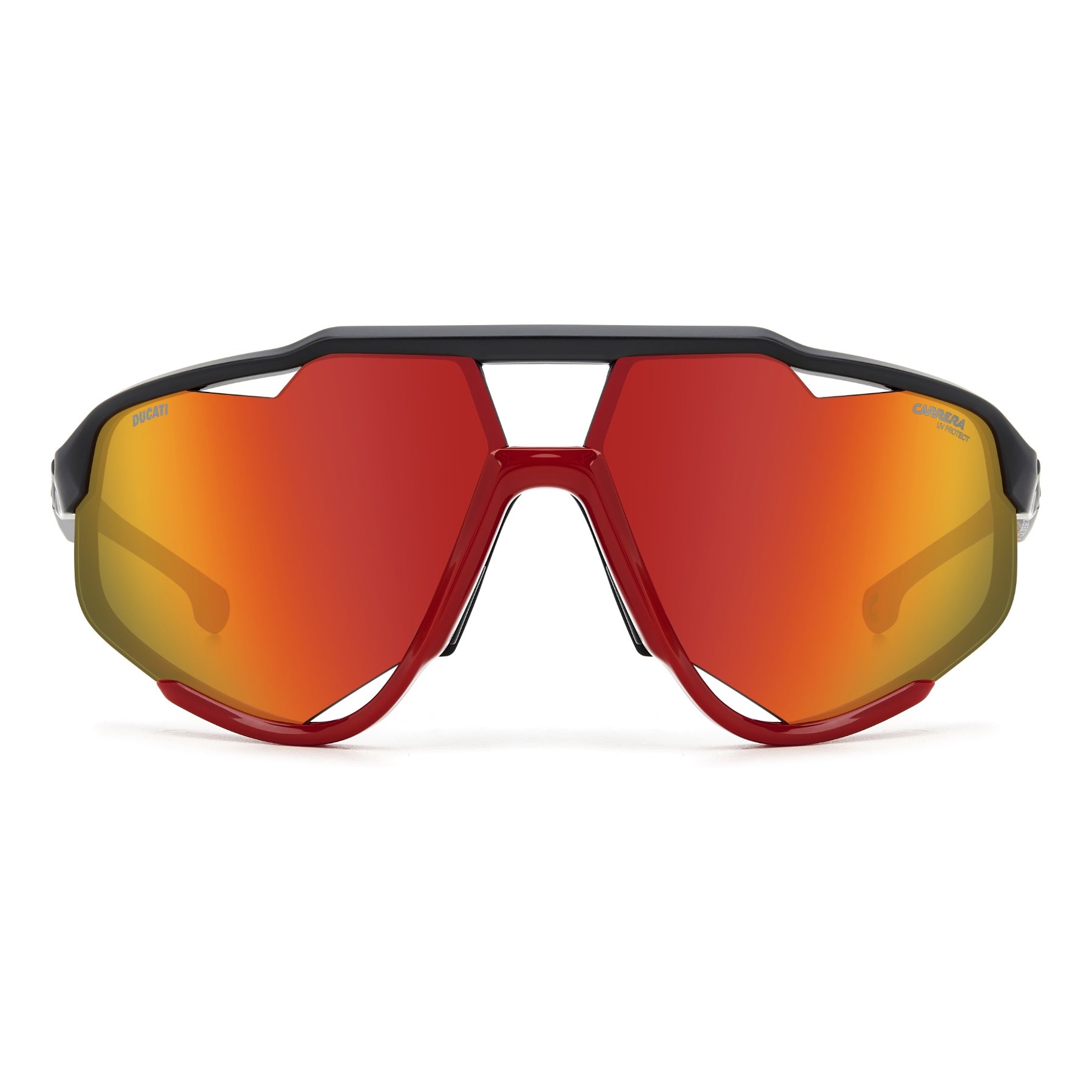 S'il y a une paire de lunettes de soleil que tous les fans de Carrera | Ducati devraient connaître, porter et chérir, c'est bien celle-là. Créée pour célébrer le lancement de la nouvelle Panigale, elle est déjà entrée dans l'histoire. La protection est assurée par la face entièrement couvrante, complétée par des orifices d’aération, des plaquettes de nez réglables et des verres miroirs. Les branches sont en métal et présentent des lignes aérodynamiques inspirées des prises d'air de l'emblématique Ducati Panigale, un logo contrasté et de confortables manchons caoutchoutés.