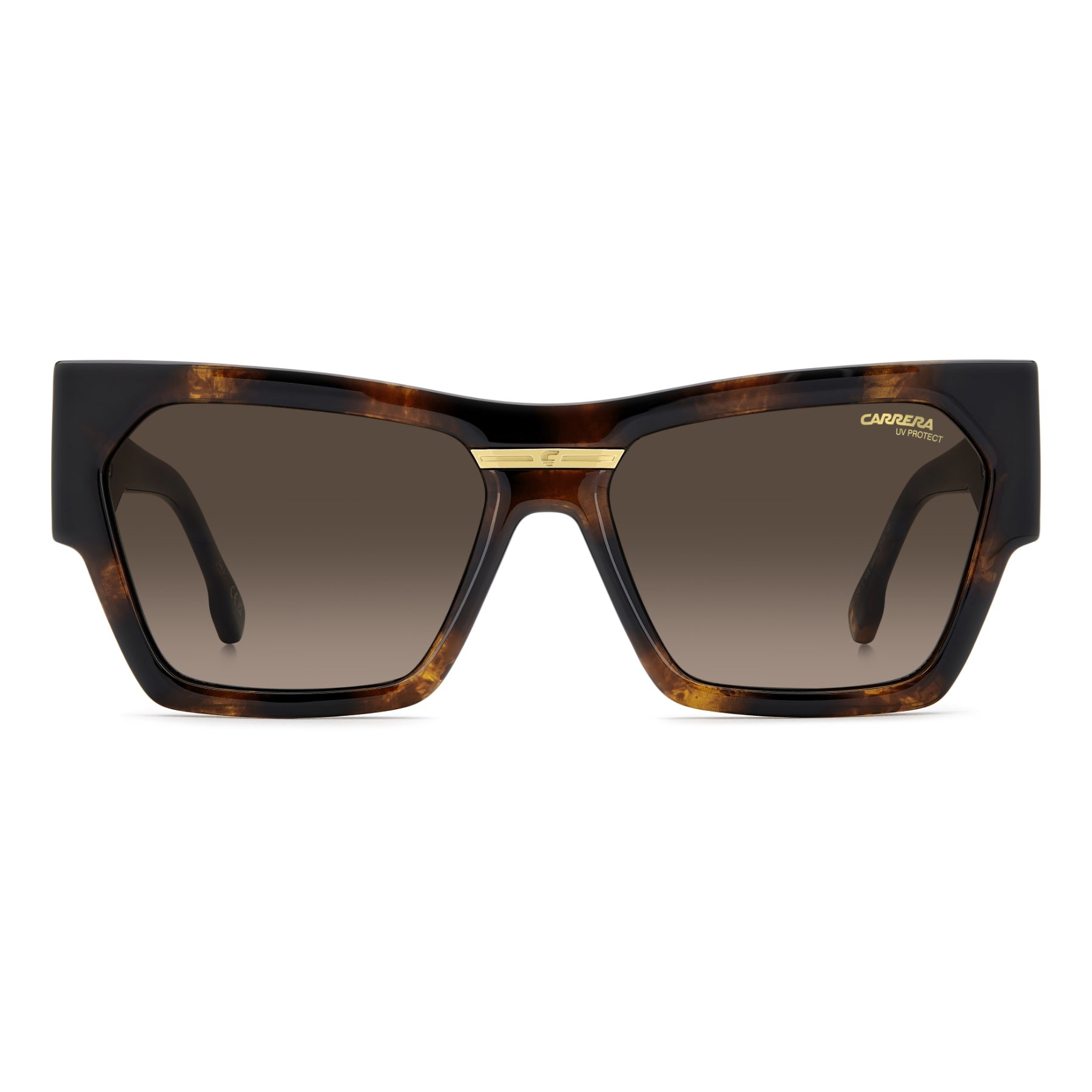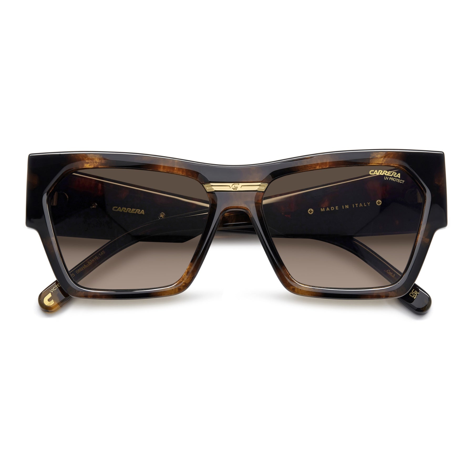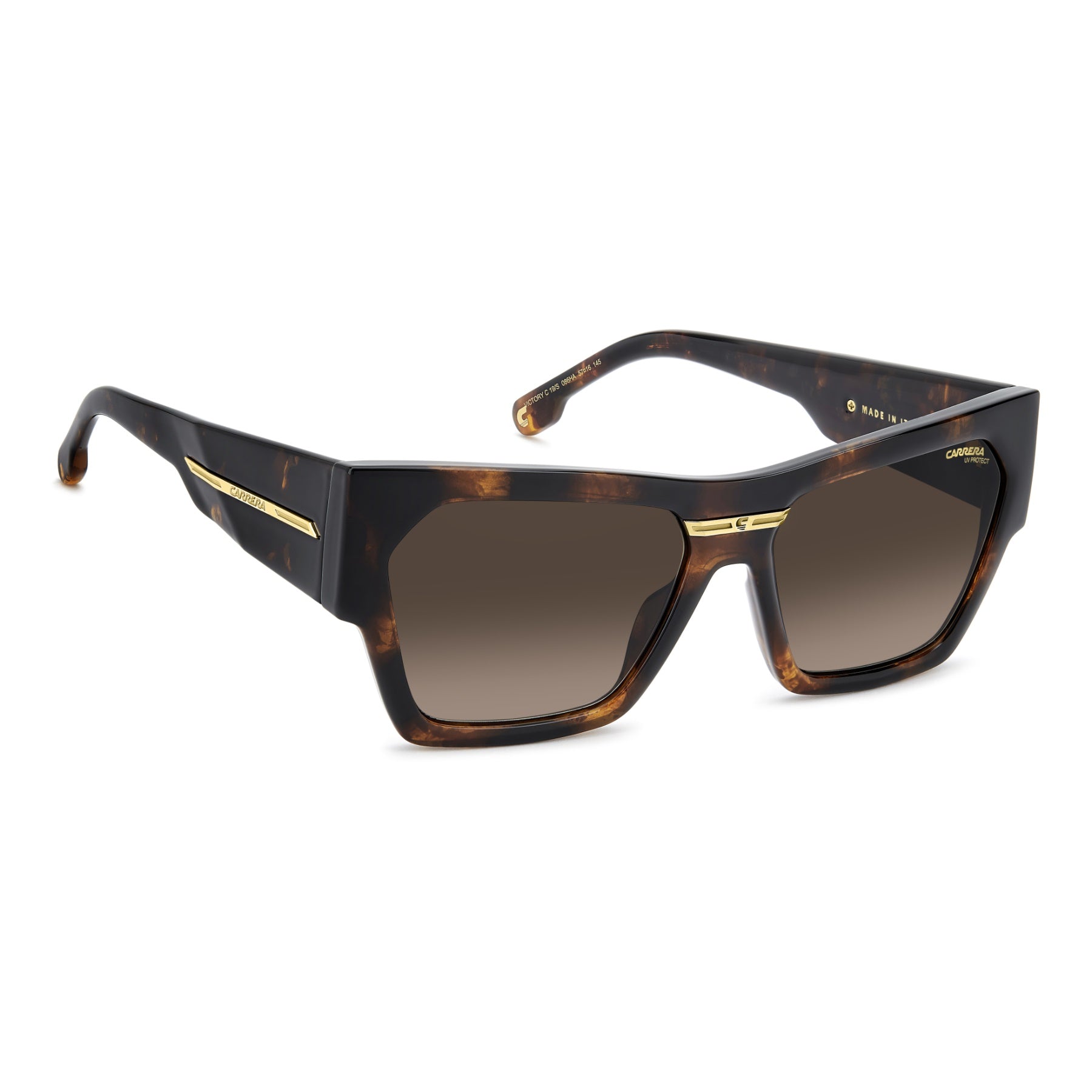 Lunettes de soleil Made-in-Italy à l'allure audacieuse. Cette paire signée Carrera présente une monture œil de chat moderne et de nouvelles branches surdimensionnées pour la saison. La plaque métallique arborant le ‘C’ propre à la collection Victory en fait une paire iconique. Disponible en version noire et dorée, le grand classique ou dans des teintes de saison, y compris une version transparente.