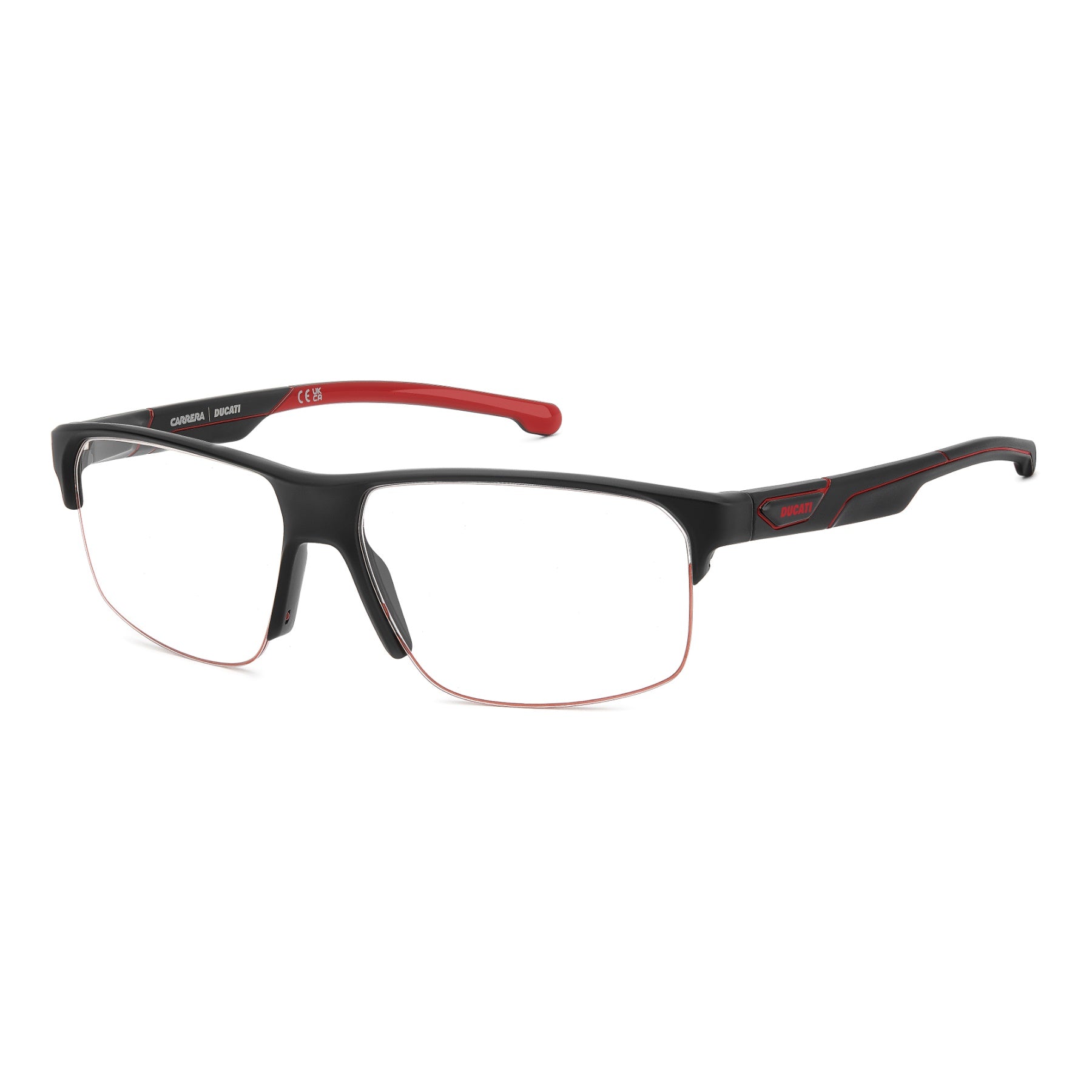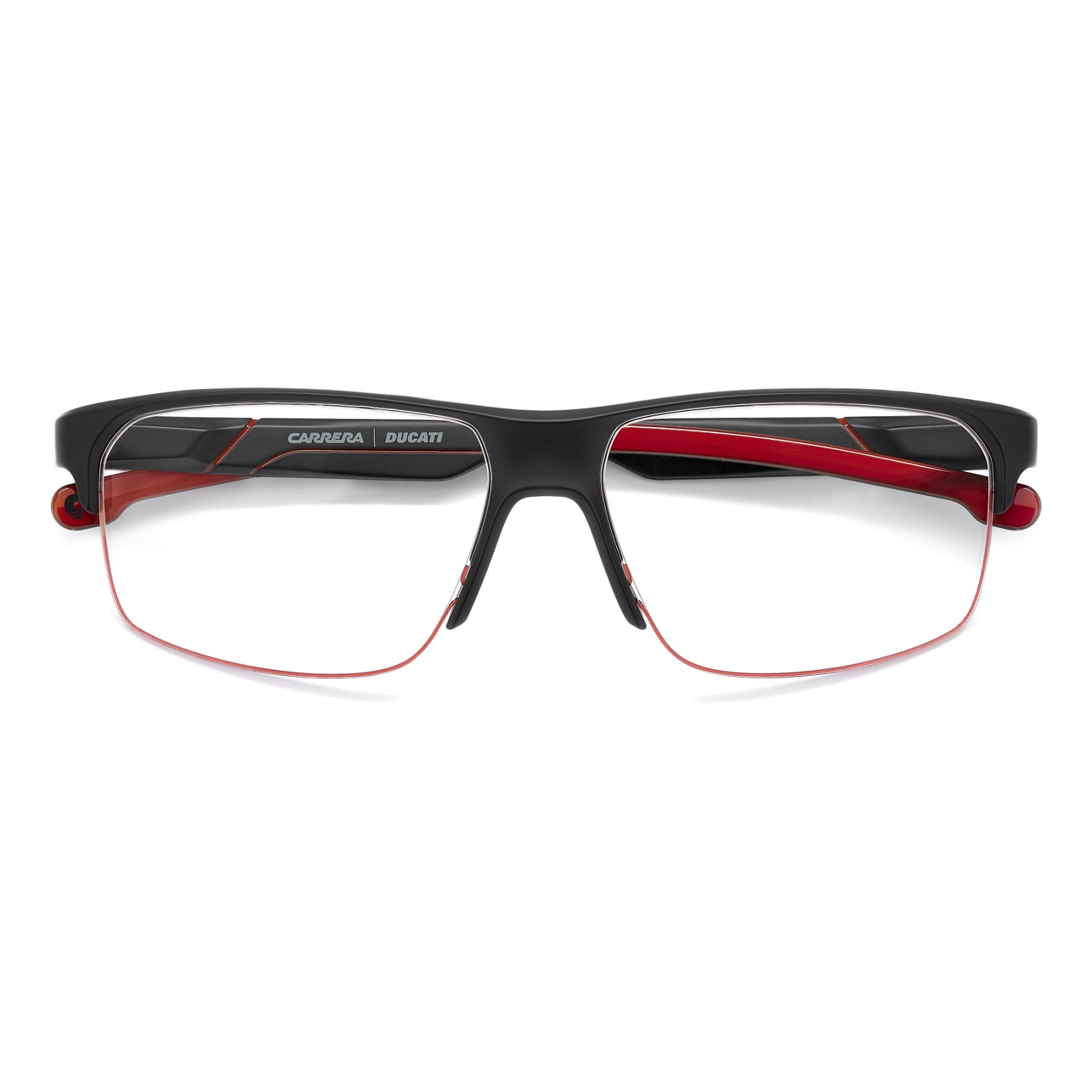 Questi occhiali da vista Carrera | Ducati conquistano i fan unendo comfort ed estetica distintiva. Il frontale a mezza montatura è leggero e versatile, proposto anche con filo di nylon colorato lungo il profilo delle lenti. Le aste hanno un design aerodinamico, tributo alle moto Ducati, e sono firmate dalla placca metallica con il logo. Dedicati a chi cerca un tocco di heritage sportivo nei look quotidiani.