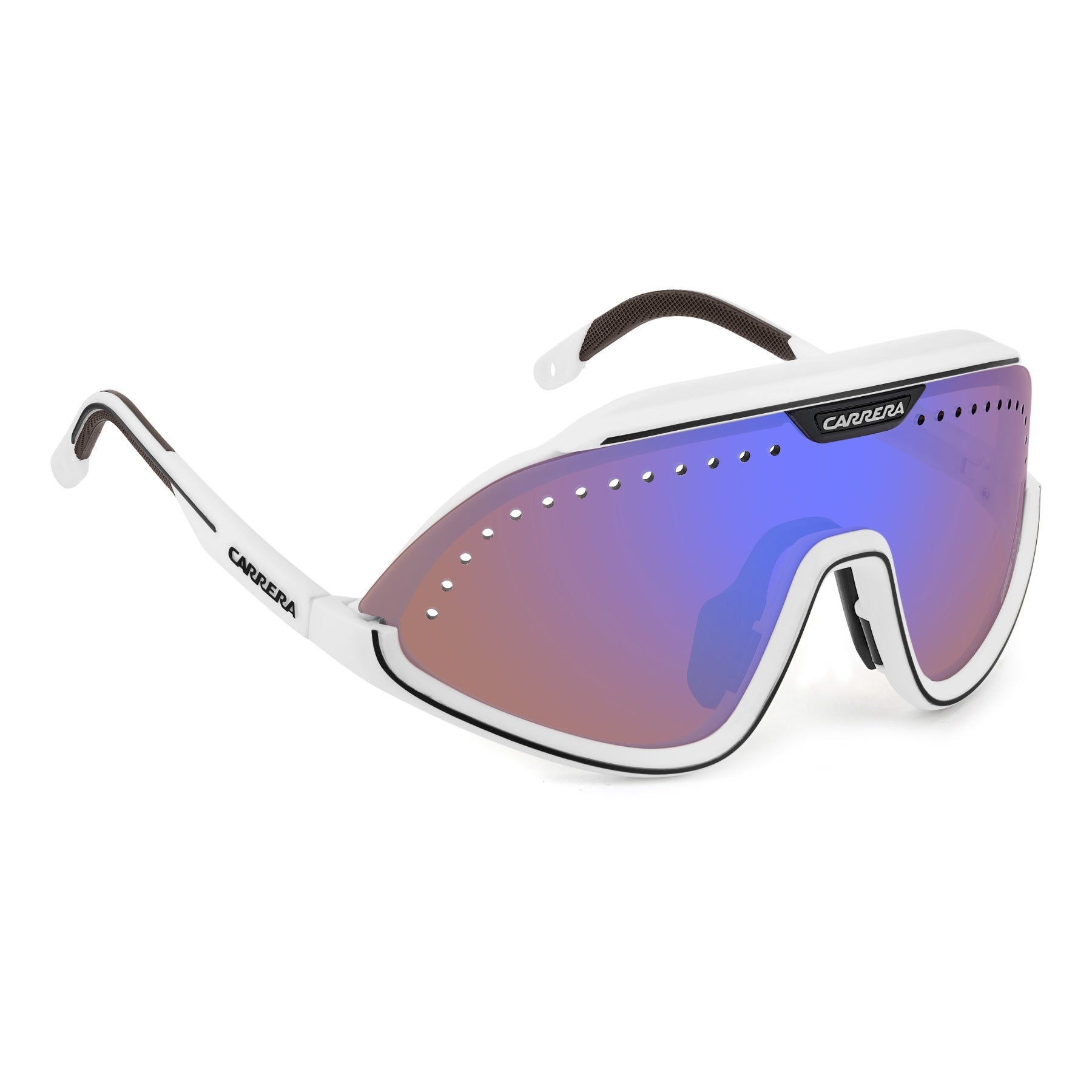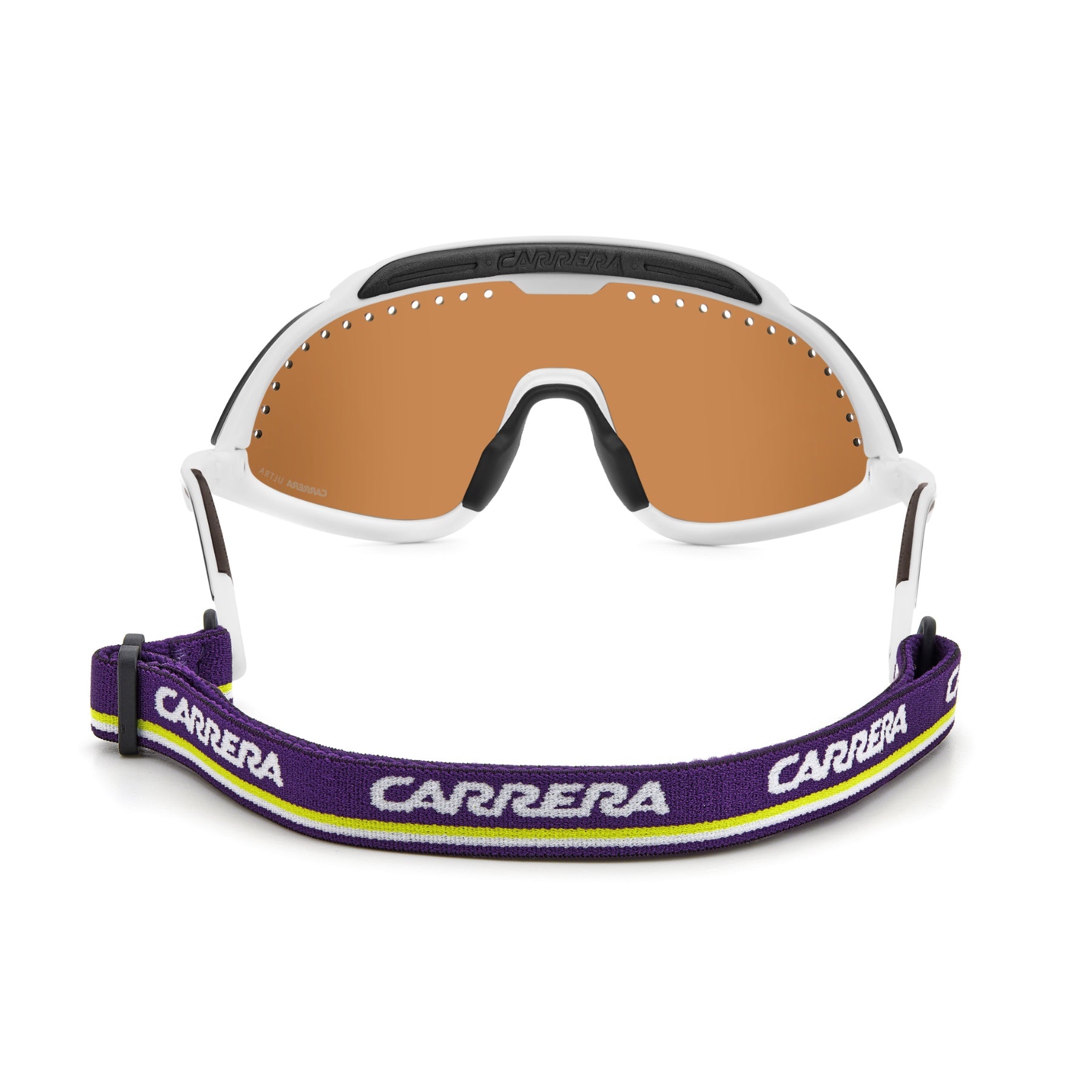 I collezionisti non si lasciano sfuggire questi occhiali da sole sportivi Carrera in edizione speciale. La maschera con fori di ventilazione arriva dall’archivio Carrera, oggi più che mai contemporanea. Include due lenti intercambiabili, dal diverso colore e grado di protezione. Il sistema di cambio lente con clip magnetiche è un brevetto Carrera. Il cordino elastico removibile è un ulteriore elemento estetico e pratico insieme.