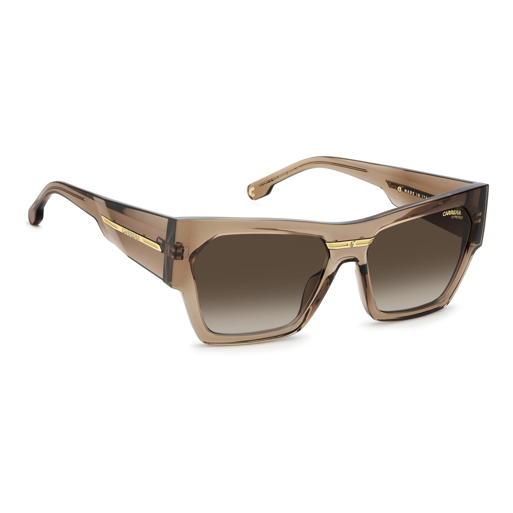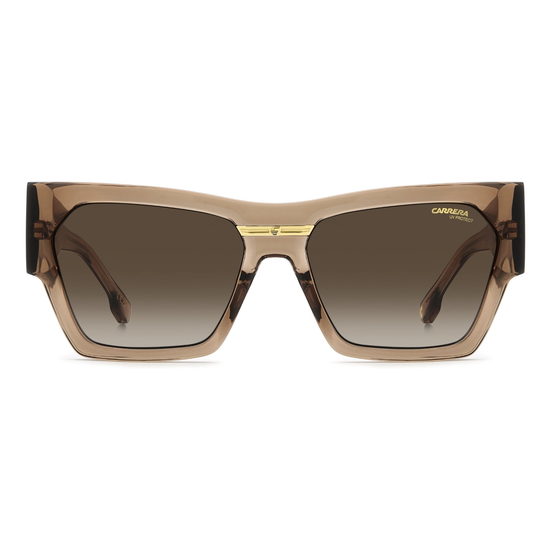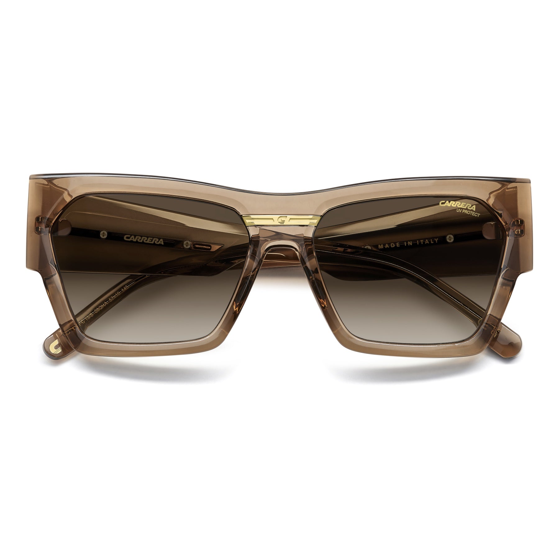 Occhiali da sole realizzati in Italia con tutto il carattere bold di Carrera. La forma cat-eye del frontale è assolutamente moderna, le maxi aste sono la novità Carrera per questa stagione. La placca metallica con la C aggiunge iconicità. Il modello arriva in nero e oro tipico Carrera o nelle nuance di stagione, anche trasparenti.