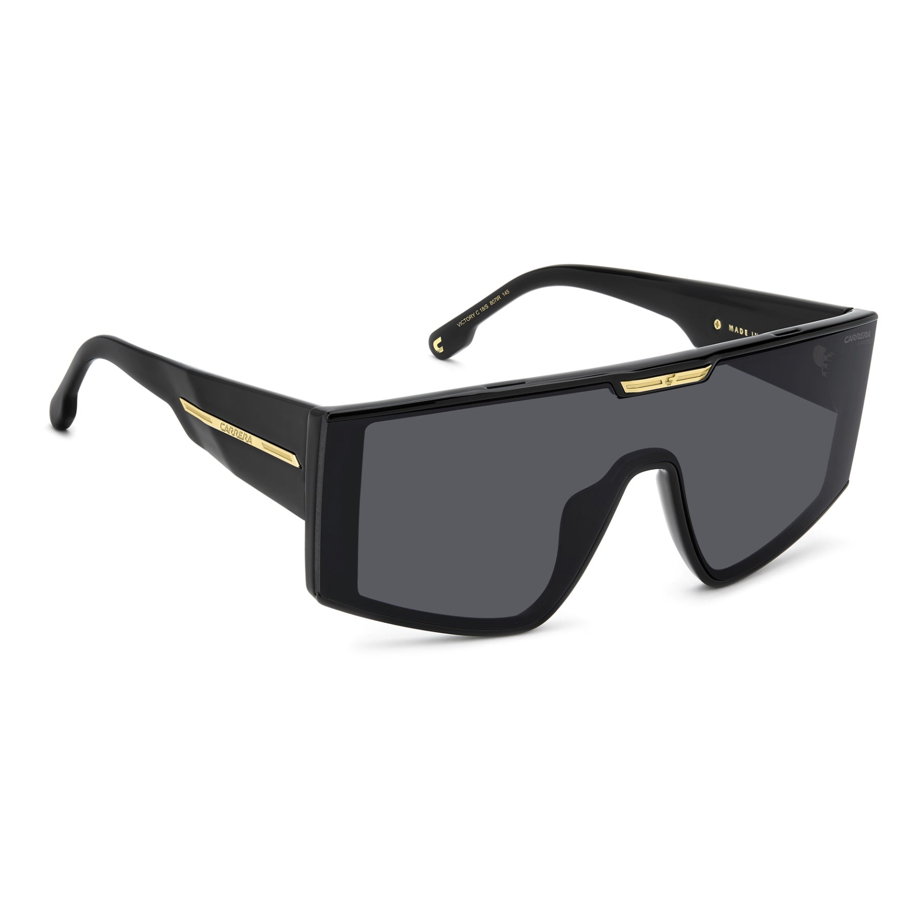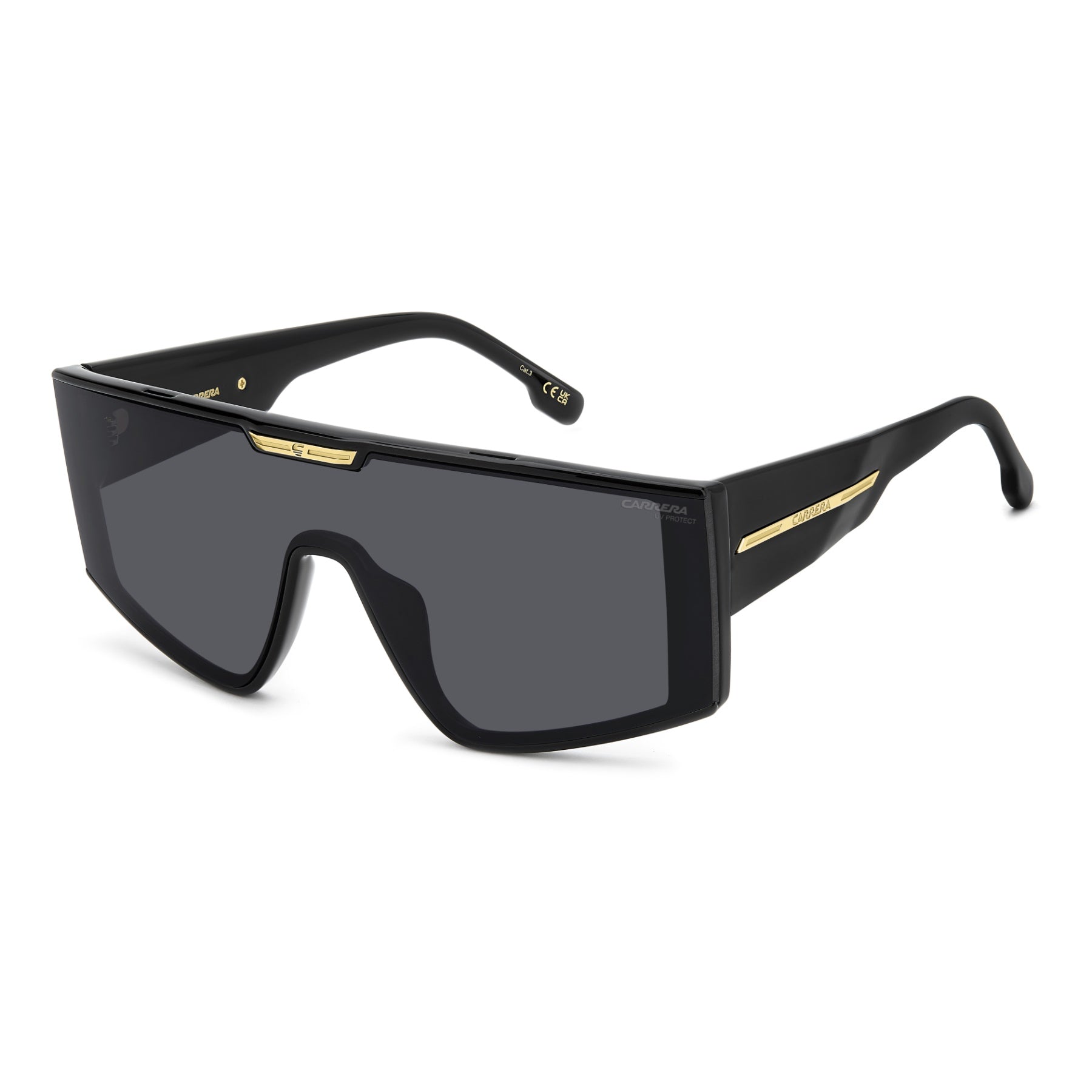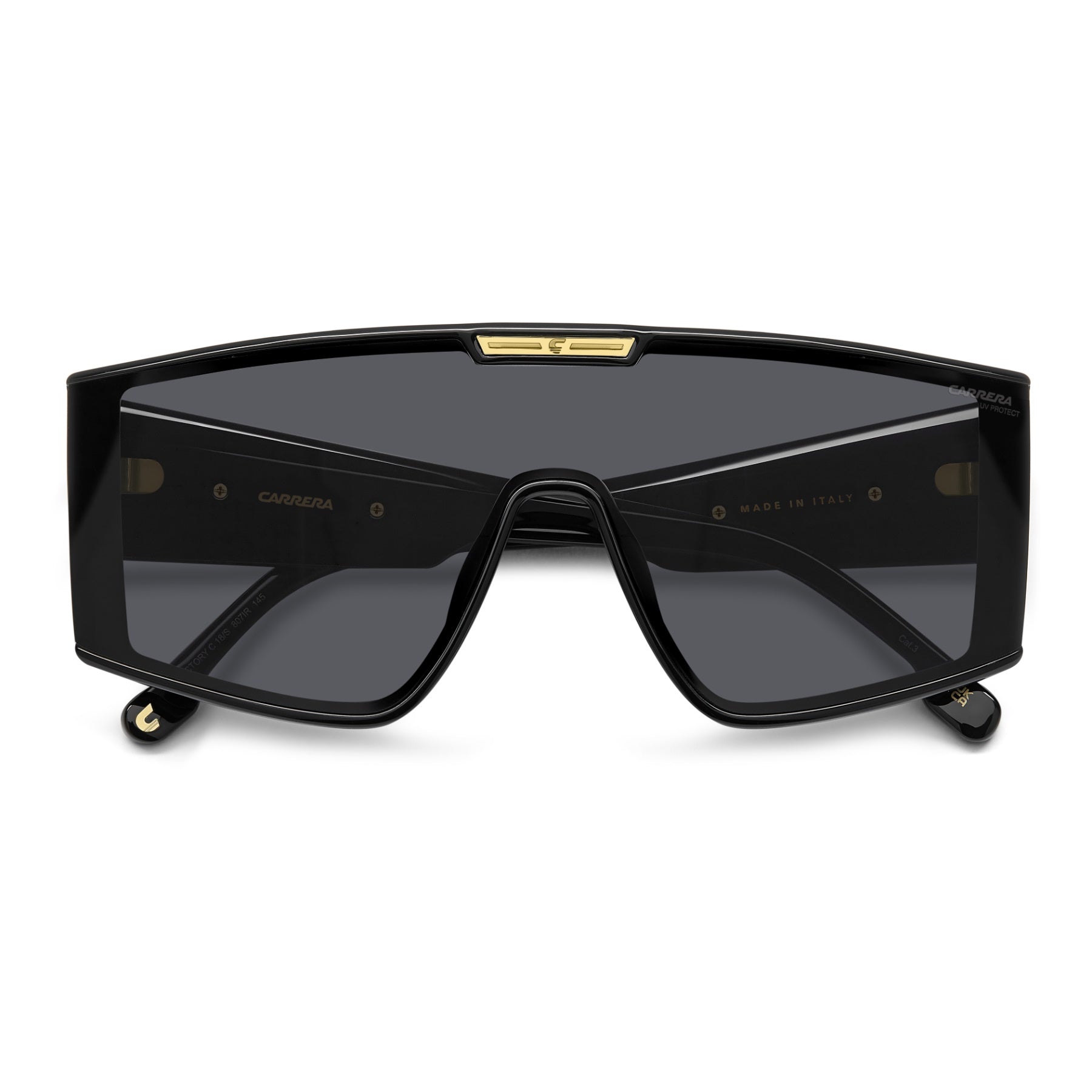 Questi occhiali da sole Carrera a mascherina sanno farsi notare. Il frontale è composto da un’unica lente, ancora più notevole nella versione specchiata. Sul lato superiore si nota la placca metallica con la C. Questa appare anche sulle maxi aste, esagerate come lo stile Carrera. Il modello è realizzato in Italia e arriva in diverse tonalità, anche con finish trasparente.