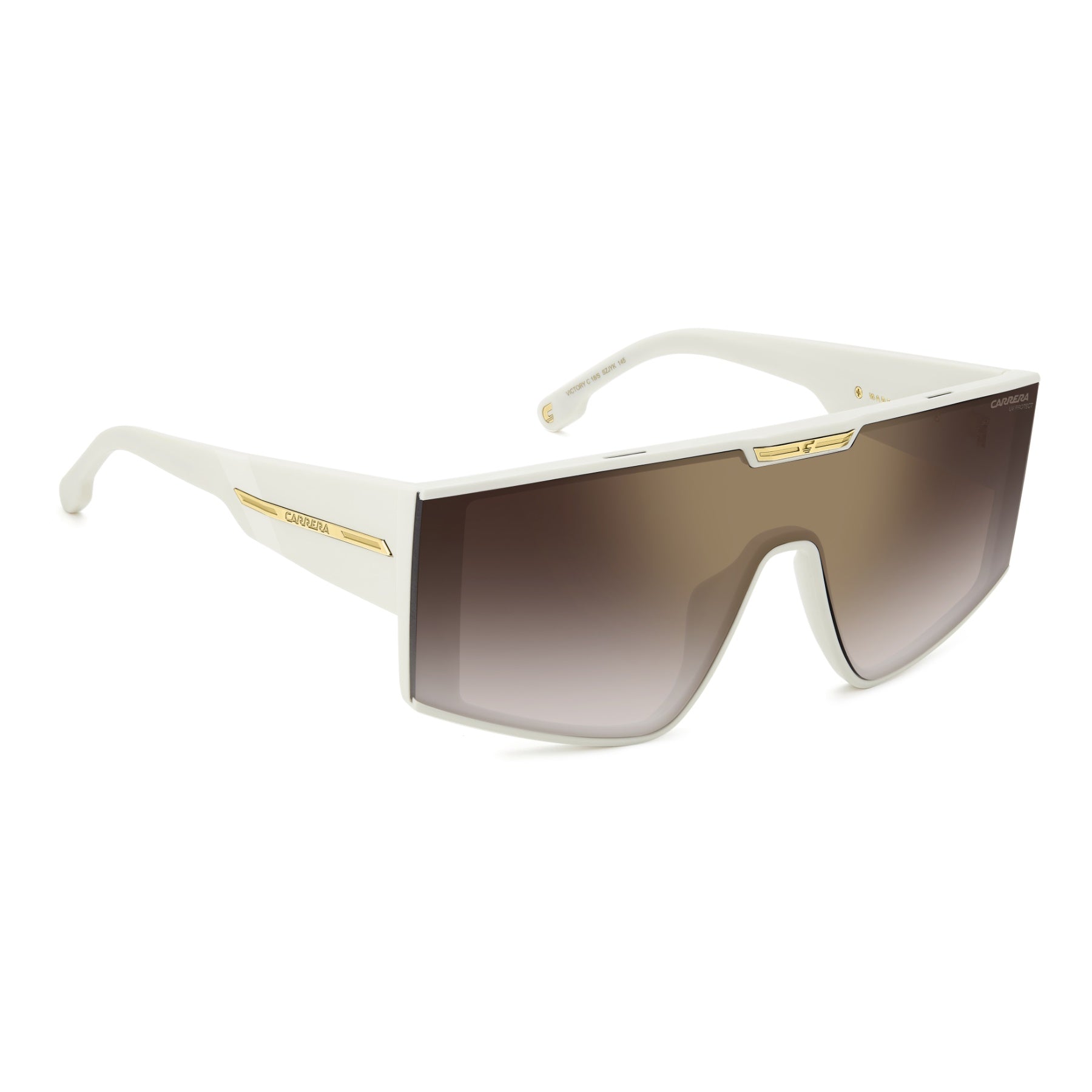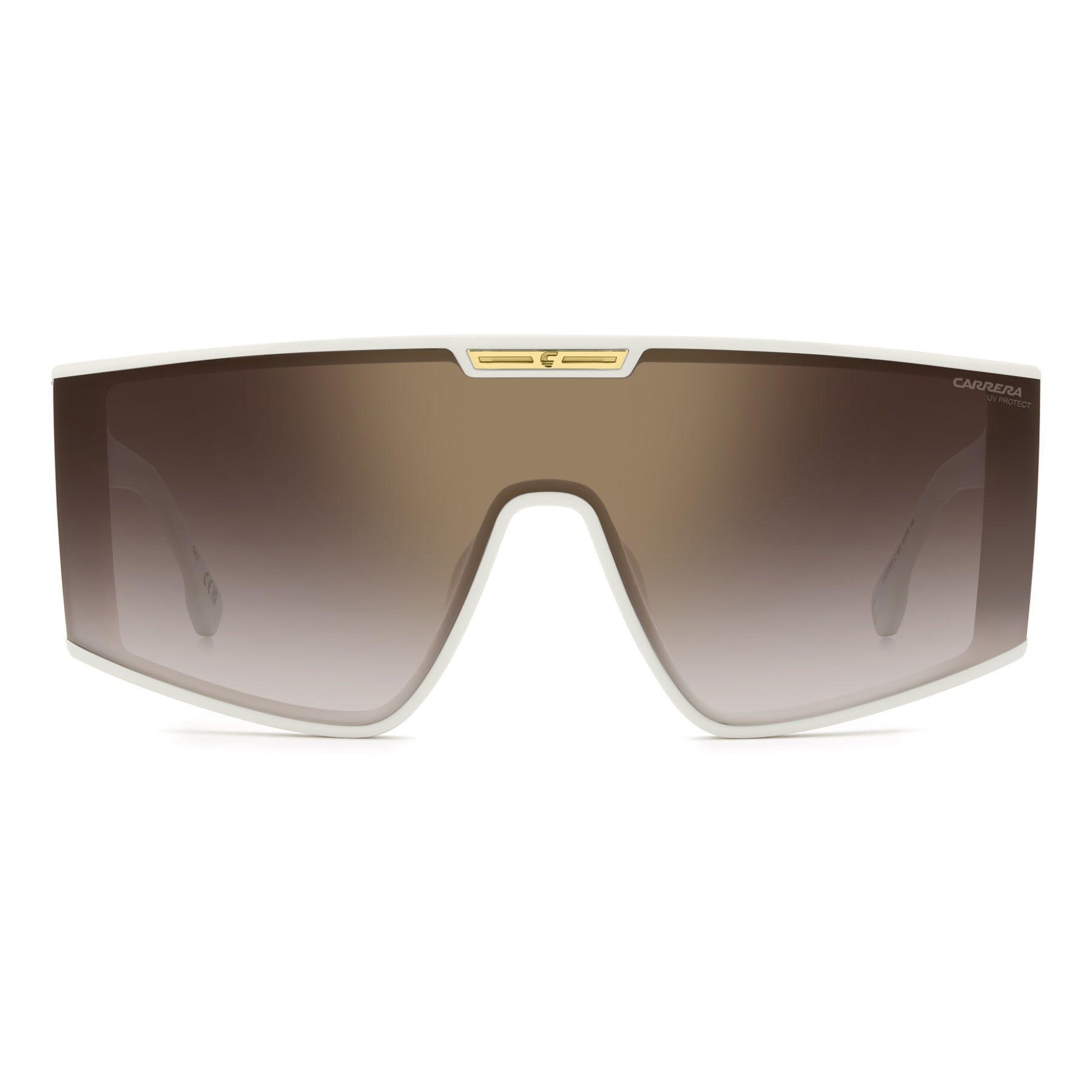 Questi occhiali da sole Carrera a mascherina sanno farsi notare. Il frontale è composto da un’unica lente, ancora più notevole nella versione specchiata. Sul lato superiore si nota la placca metallica con la C. Questa appare anche sulle maxi aste, esagerate come lo stile Carrera. Il modello è realizzato in Italia e arriva in diverse tonalità, anche con finish trasparente.