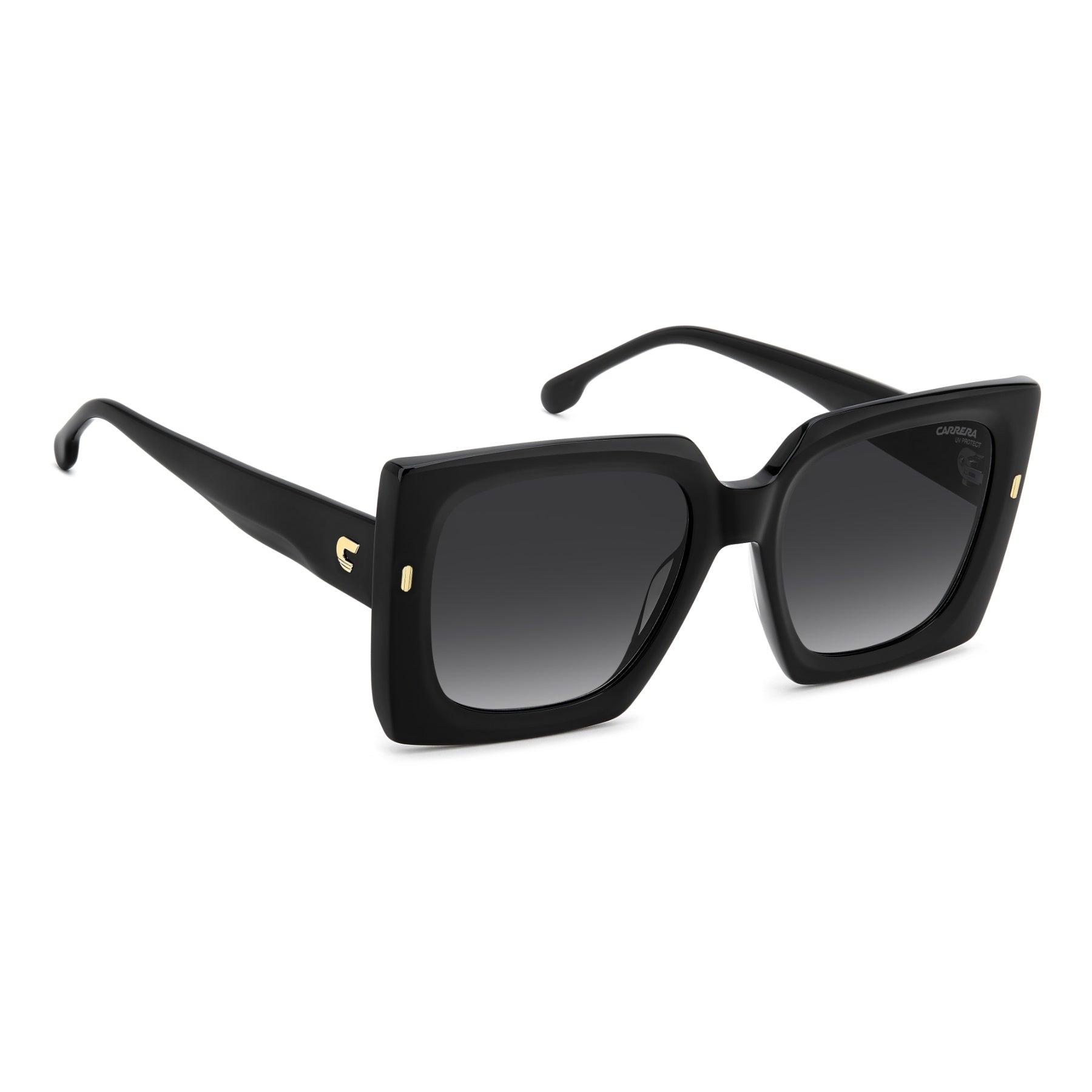 Questi occhiali da sole Carrera esprimono eleganza audace e personalità distintiva. Il frontale a farfalla è oversize, con profili scolpiti e rivetti posti in verticale per una dose extra di carattere. Sulle aste si nota la C in rilievo, simbolo del brand. In versione trasparente o havana colorata, in ogni caso certezza di stile inimitabile Carrera.