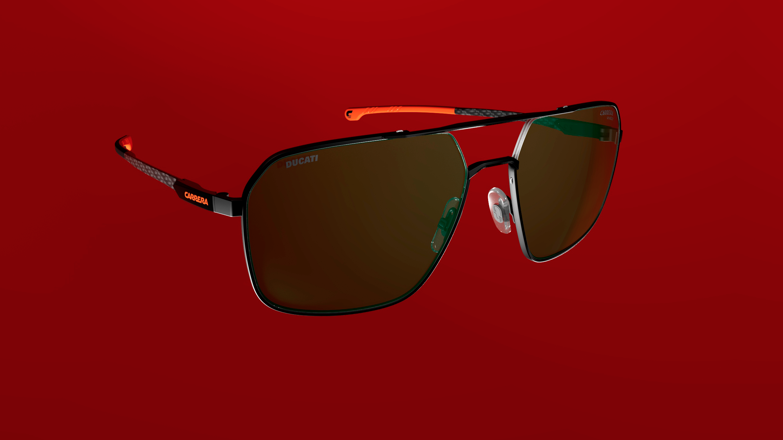 La linea delle aste richiama le nervature della carena della Ducati Panigale bilanciando ad arte eleganza e sportività. Le cerniere flessibili integrate e le aste dritte completano questa gamma di occhiali, sviluppata a quattro mani da Carrera e Ducati, perfetta per un utilizzo quotidiano, anche sotto a un casco da moto.