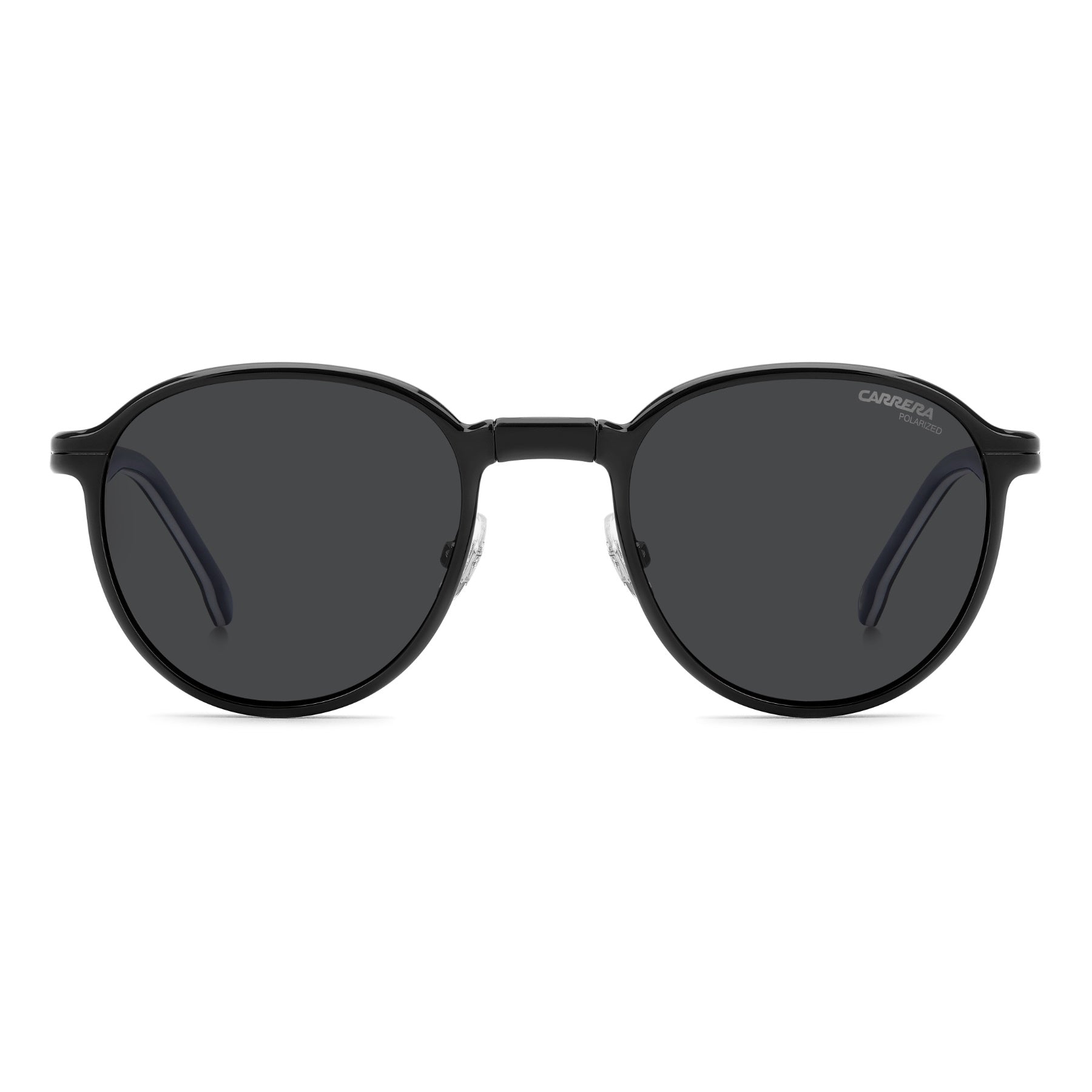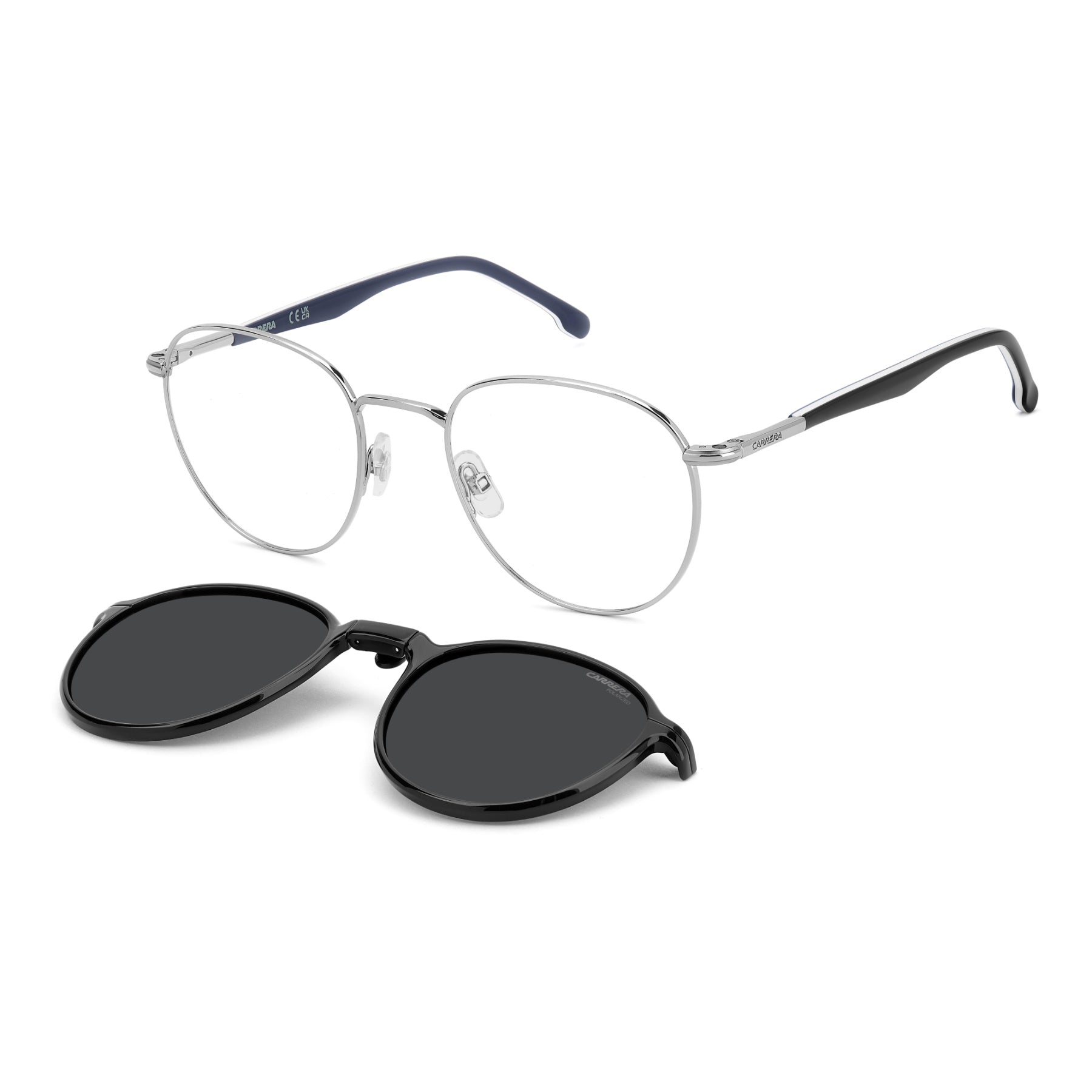 These Carrera eyeglasses combine essential elegance with a round silhouette that won't ever go out of style. One standout version features an enamel front and multi-layer end tips in Carrera’s signature colours. Foldable clip-on sun lenses offer added practicality.
